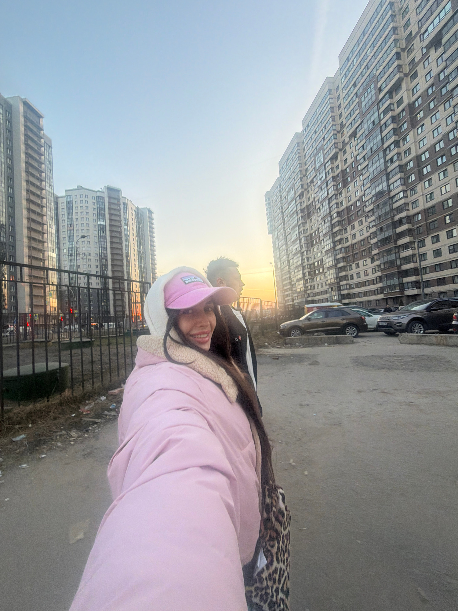 The image shows two people standing on a sidewalk next to a road in Saint Petersburg, Russia. The person closest to the camera is wearing a pink jacket and a pink hat. Behind them is another person wi…read more