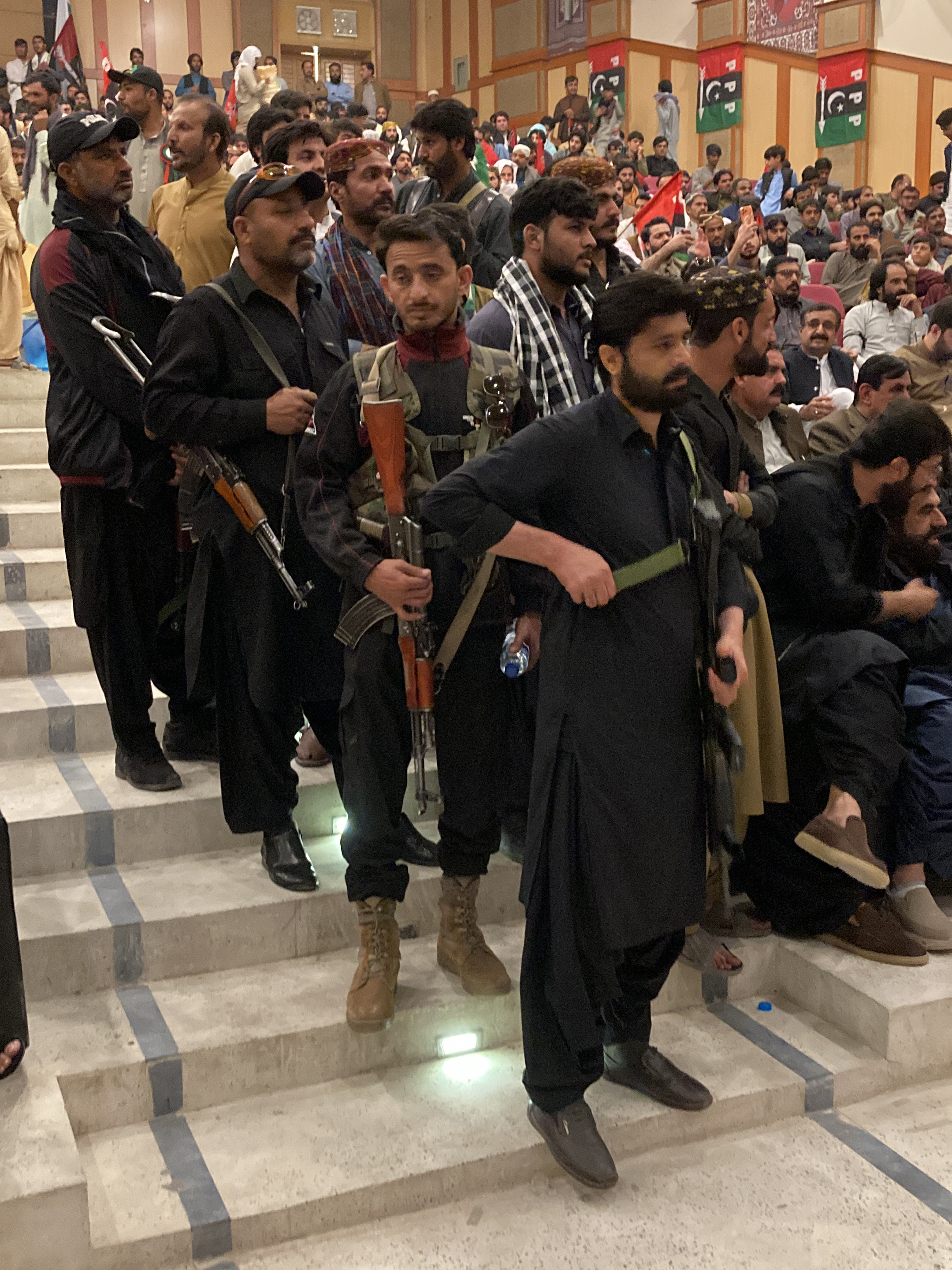 The image shows a group of armed men on stairs in what appears to be a large hall or auditorium. The men are dressed in a mix of traditional and tactical clothing, including shalwar kameez and militar…read more