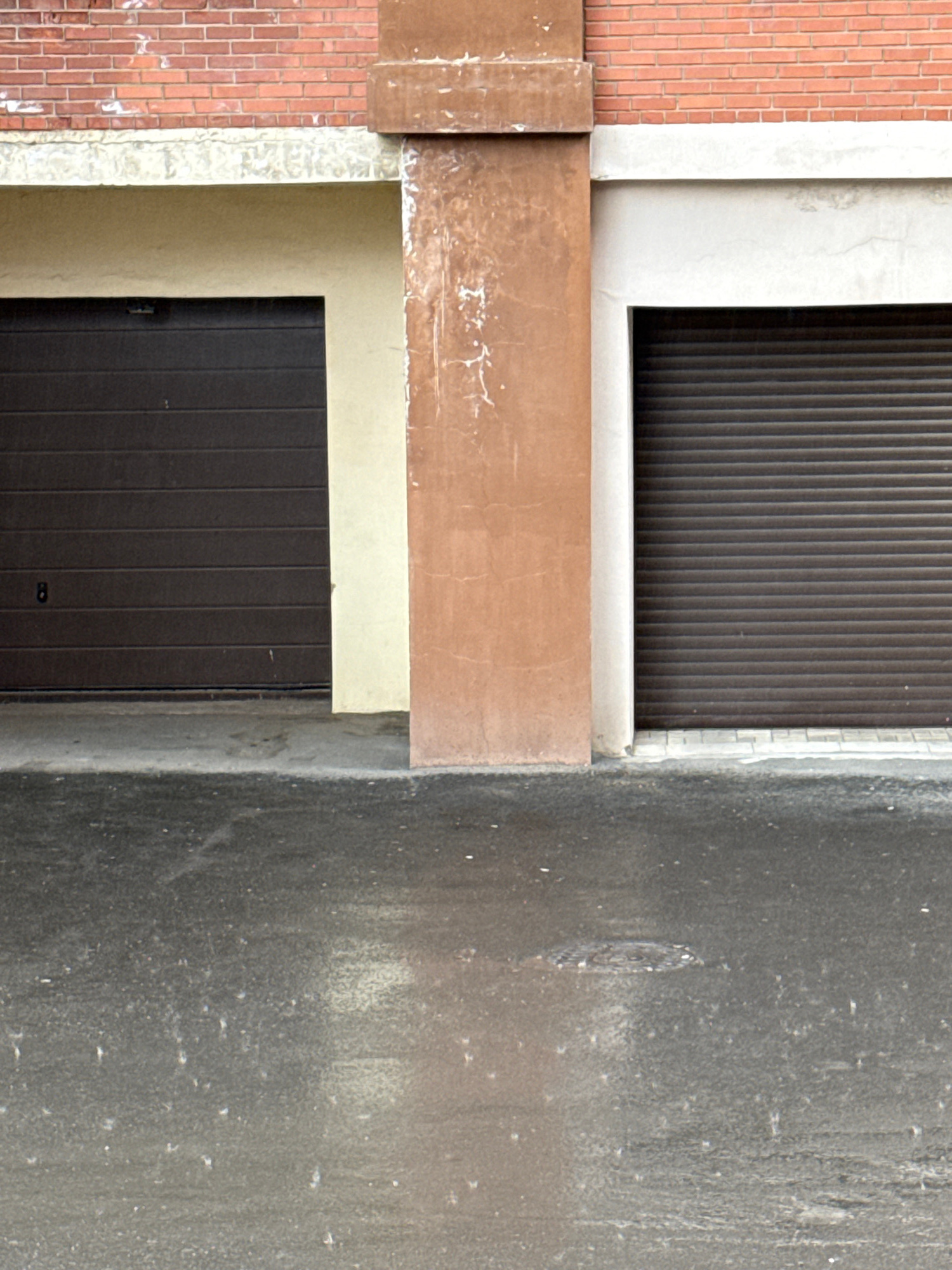 The image depicts a close-up of architectural details, featuring a brick wall on the left, a brown metal shutter above, a brown horizontal beam, and a dark brown door below. A textured gray concrete w…read more