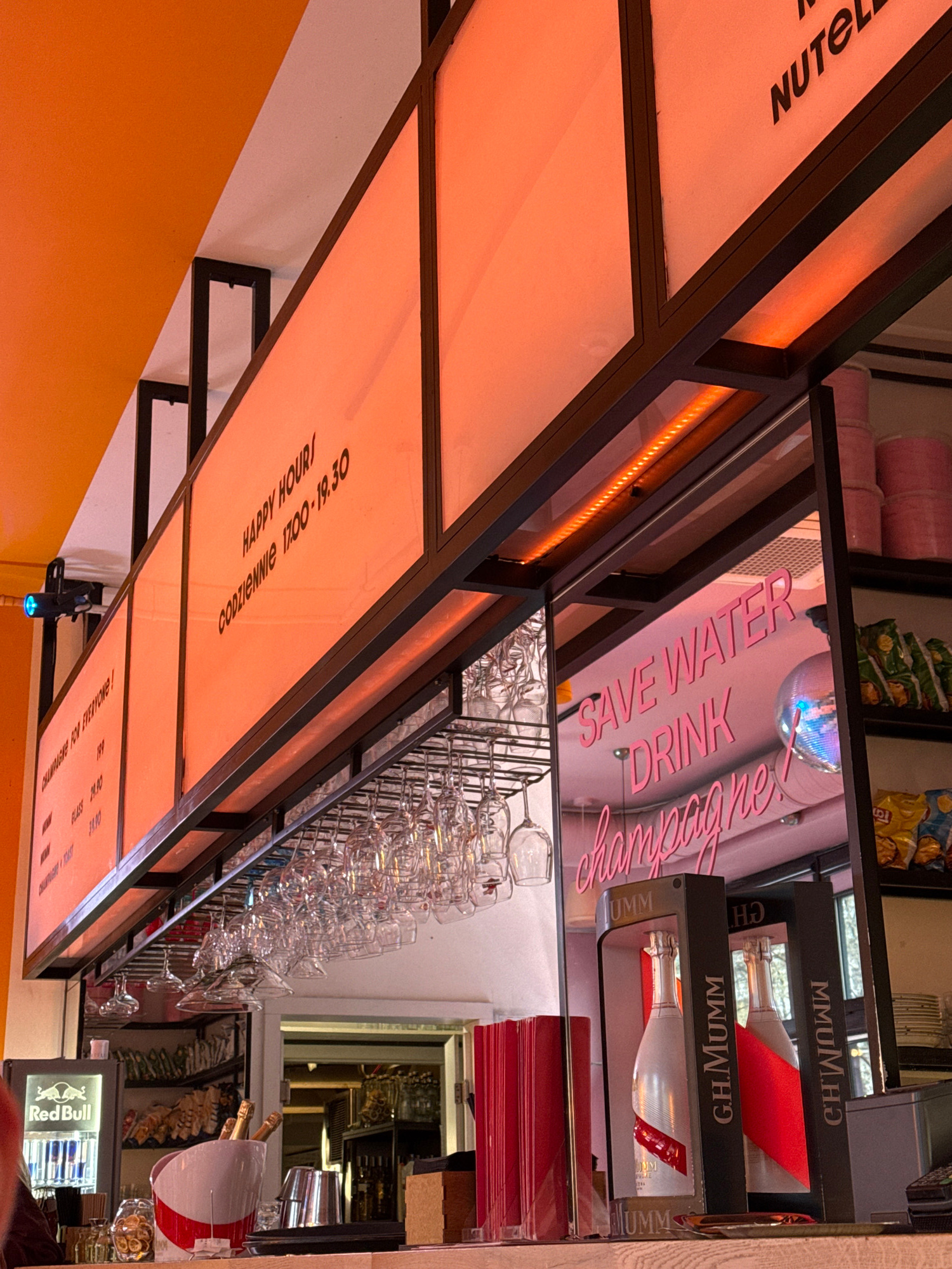 A vertically oriented close-up shot captures the interior of a bar, likely located in Kraków, Poland, as suggested by the Russian text on the menu. The bar's design features orange walls and a dark me…read more