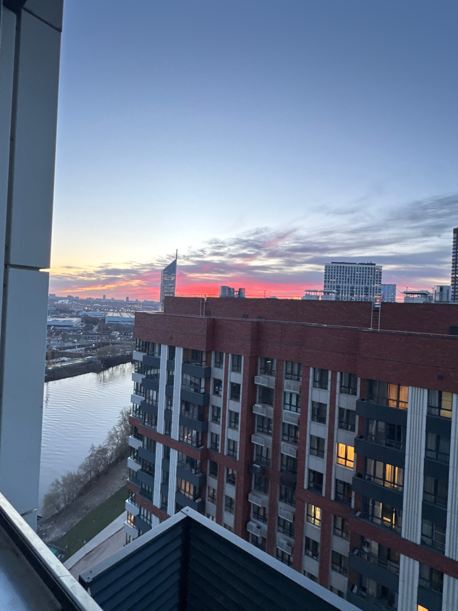 The image shows an aerial view of a cityscape at sunset, likely taken from a high vantage point, possibly a balcony. The location is assumed to be Khimki, Russia. In the foreground, a metallic railin…read more