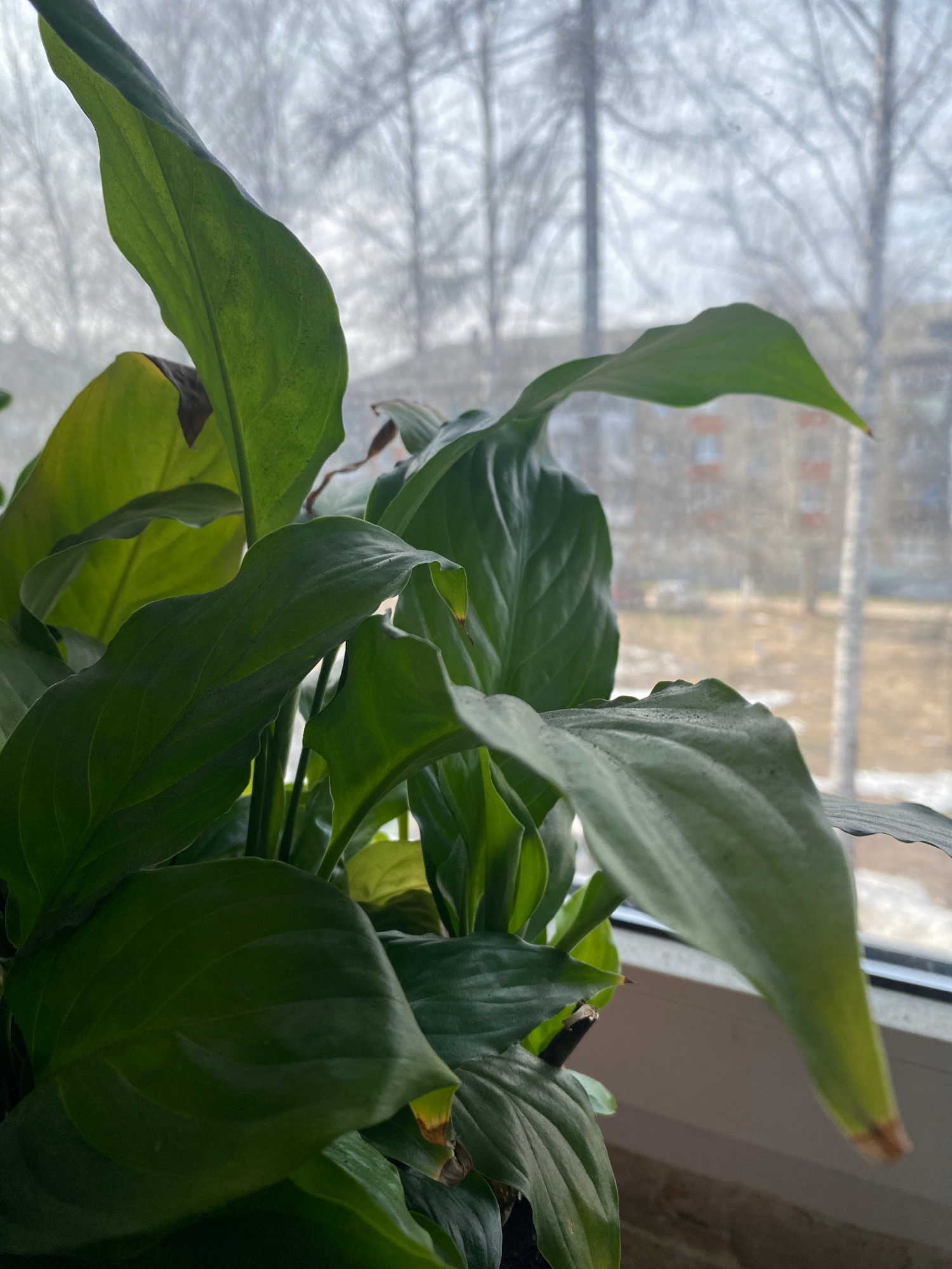 The image shows a Peace Lily plant indoors. The plant has large, green leaves, some of which have brown tips. The plant is positioned in front of a window. Outside the window, there is a view of build…read more