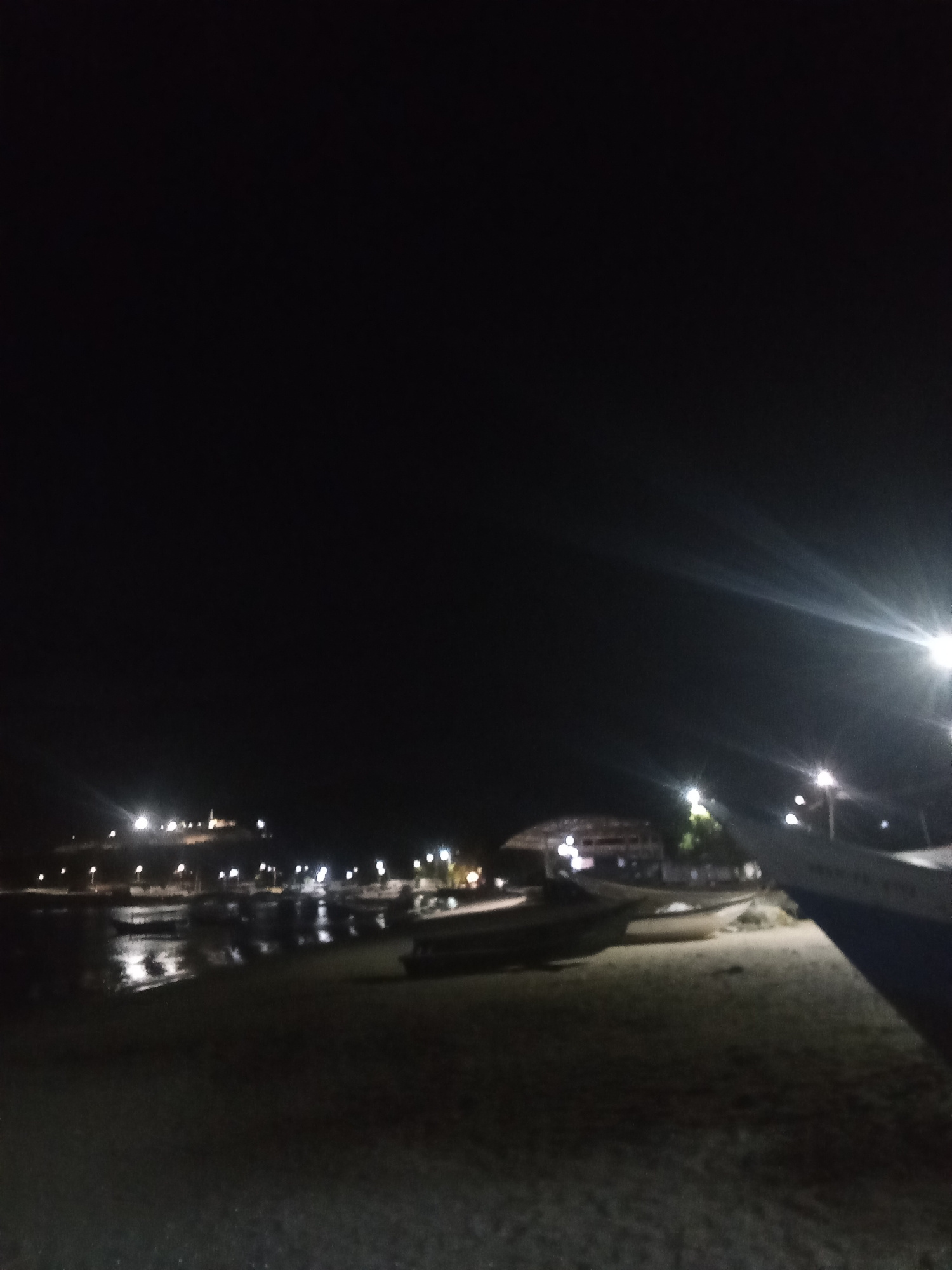 The image captures a night scene on the beach in Juan Griego, Venezuela. The scene is dominated by darkness, with only a few sources of light illuminating the landscape. In the distance, there's a bui…read more