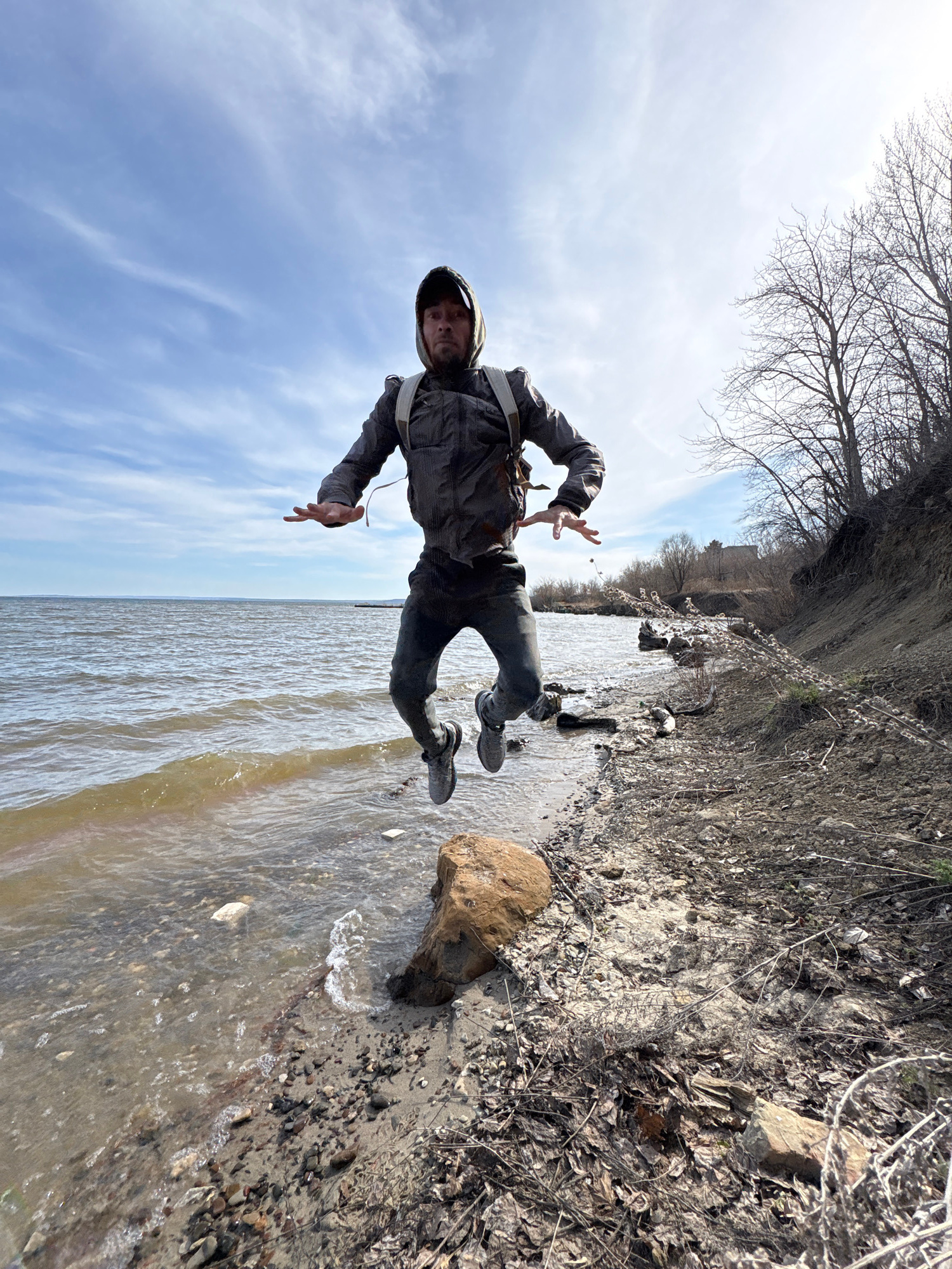 This outdoor photograph captures a man in a dynamic pose by a body of water, likely a river or lake, in what could be Ulyanovsk, Russia. The man, positioned on the left side of the frame, is wearing a…read more