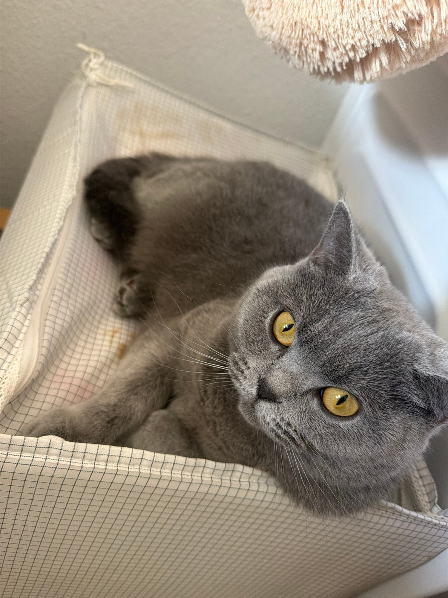 A gray, short-haired cat with yellow eyes is seated in a white fabric hammock. The fabric is marked with brown stains. The hammock has a blue checkered pattern on the side. A tan, cylindrical object i…read more