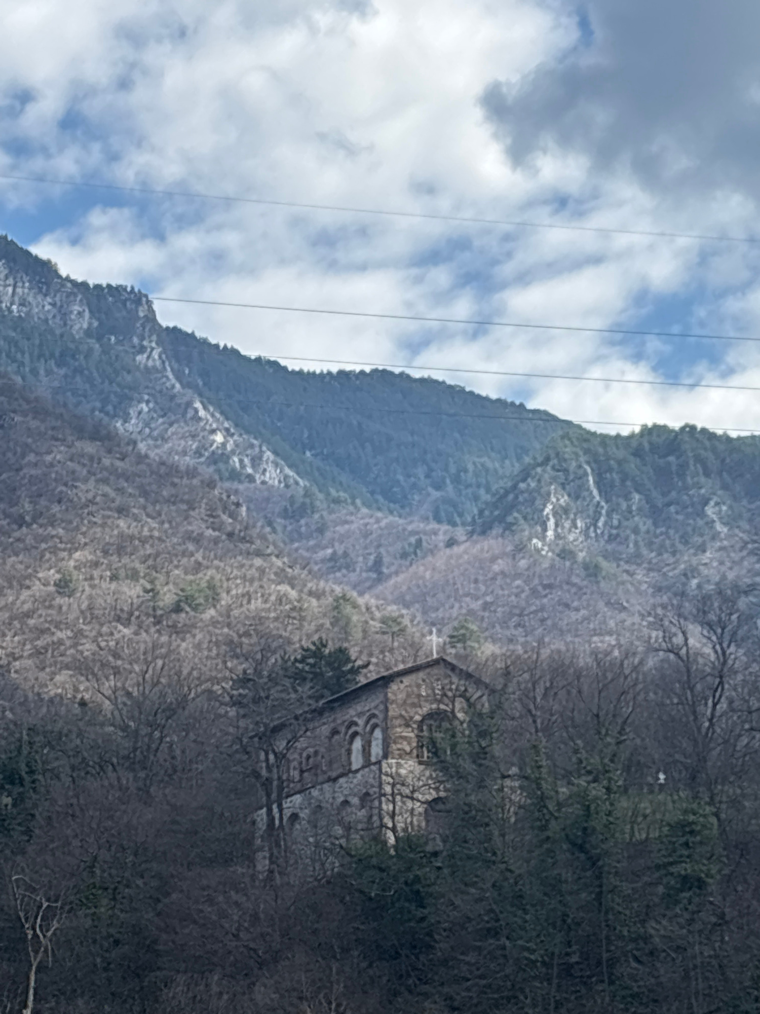 A landscape photograph taken in Bachkovo, Bulgaria shows a steep mountain range partially obscured by bare trees and a cloudy sky with power lines in the foreground. Nestled among the trees on the rig…read more