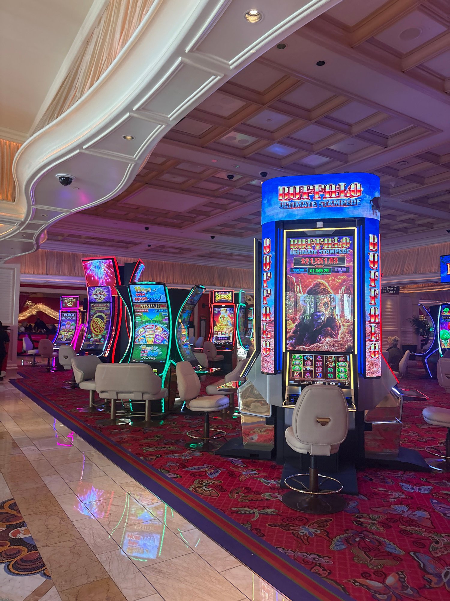 The image shows a row of slot machines in a casino in Las Vegas, United States of America. The closest machine is a "Buffalo Ultimate Stampede" slot machine. Further down the row are other slot machin…read more
