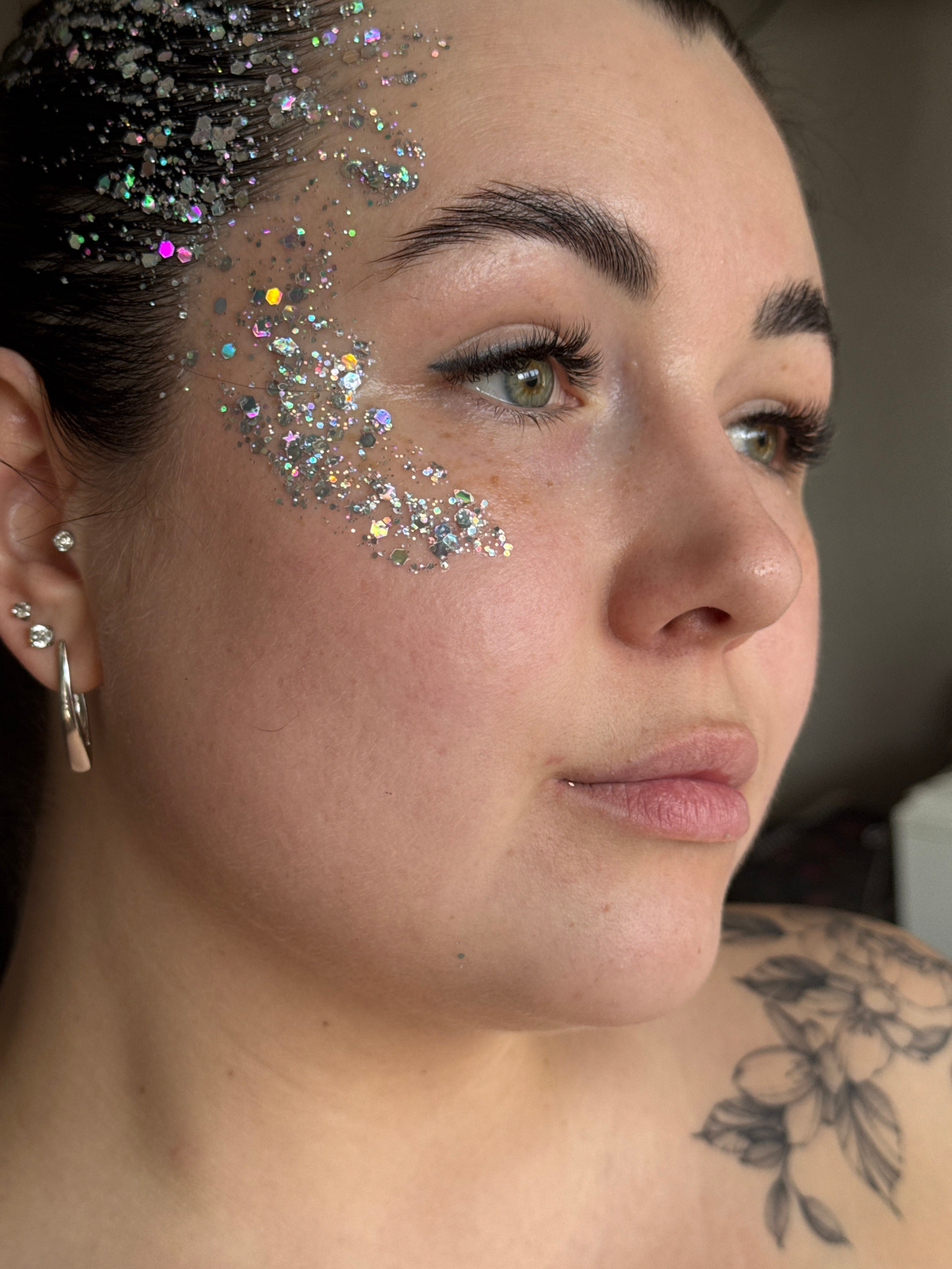 The image presents a close-up portrait of a person, likely female, positioned with her head tilted back, looking upwards and to the right of the frame. Her face, seen from a low-angle profile, is the…read more