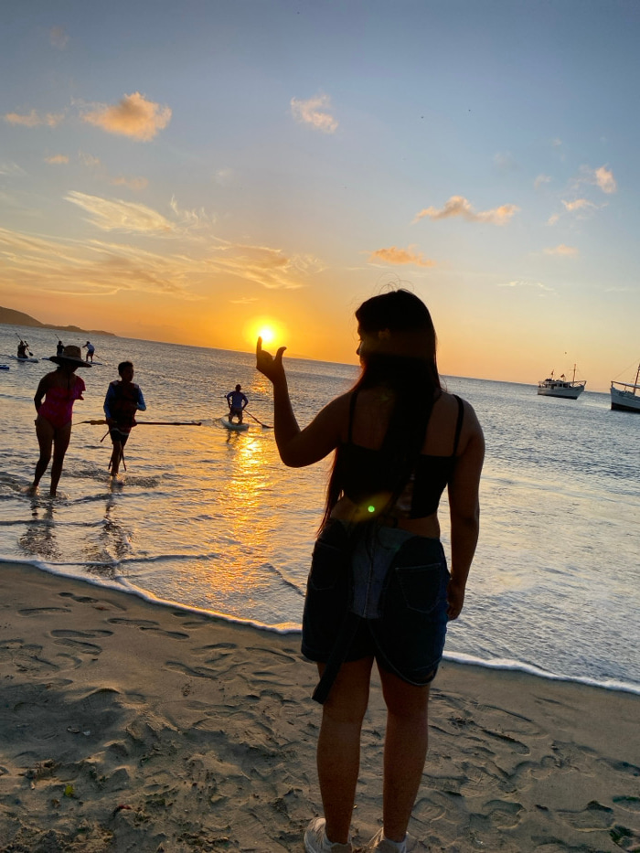 The image depicts a sunset scene on a sandy beach located in Juan Griego, Venezuela. In the immediate foreground, a female subject is viewed from behind, standing on the wet sand. She has long, dark…read more