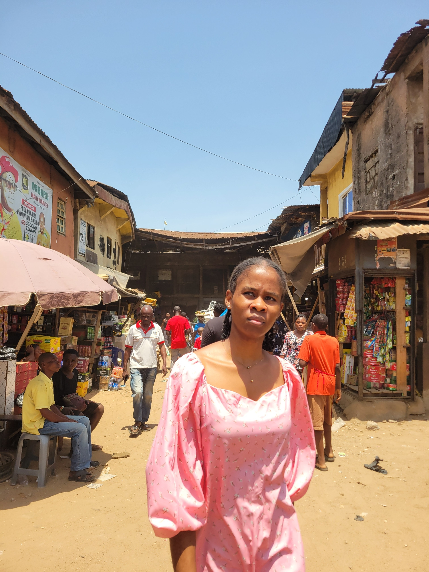 This image captures a vibrant street scene, likely a market or commercial area, in Onitsha, Nigeria. The bright, clear blue sky indicates it is daytime, under sunny weather conditions. In the foregro…read more