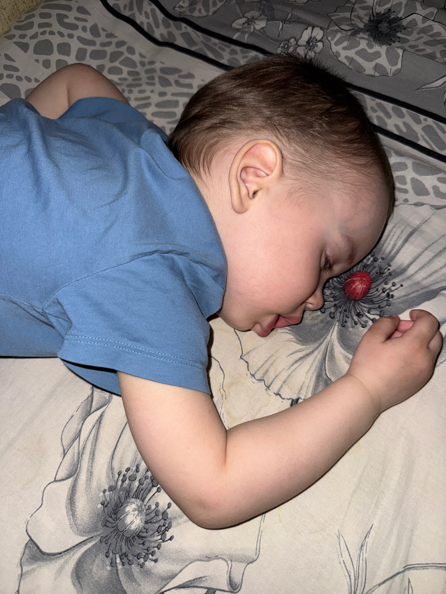 A baby is lying on their side on a bed. The baby has light skin, brown hair, and is wearing a blue t-shirt. Their mouth is slightly open, and their right arm is raised with their hand near a floral de…read more