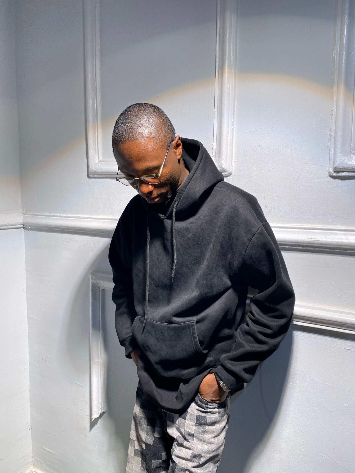 A Black male individual, appearing to be an adult, is depicted standing in an indoor setting. He has a closely shaven head and wears thin, gold-framed glasses. He is dressed in a dark (likely black or…read more