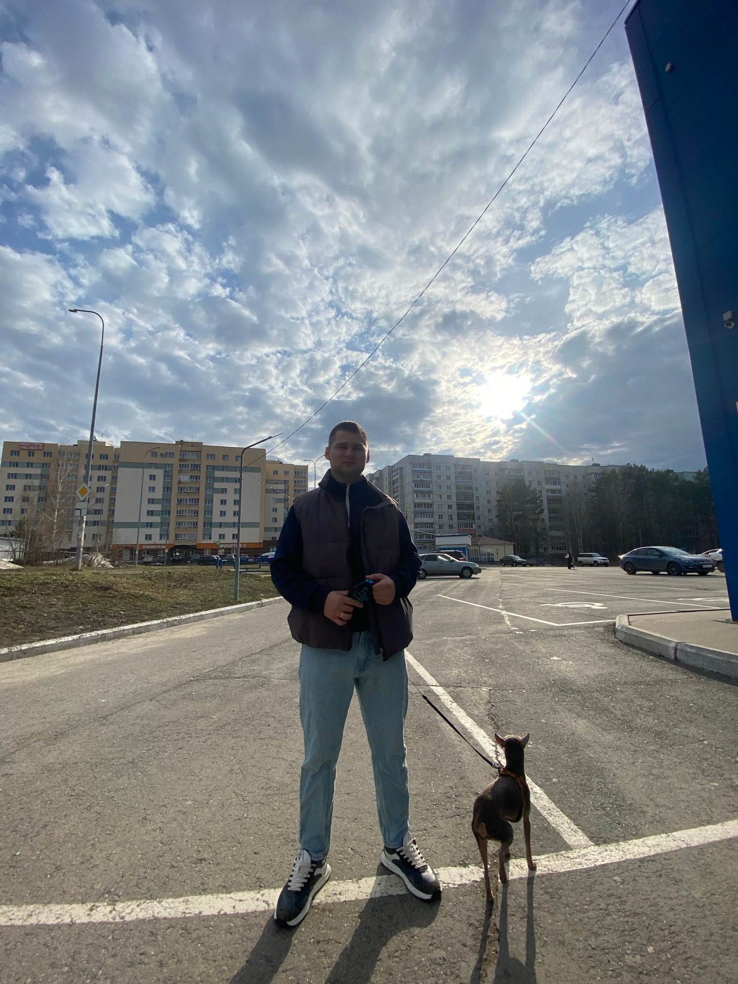 The image captures a man walking a small dog on a sunny, partially cloudy day in what appears to be an urban or suburban setting, specifically Chaikovsky, Russia. The man, positioned slightly left of…read more