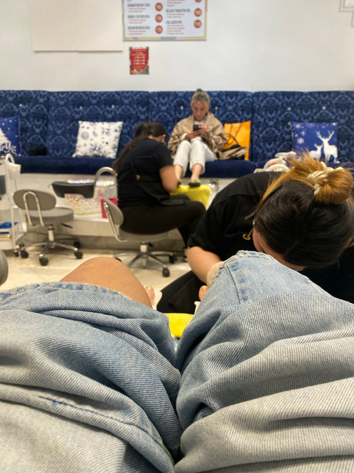 The image shows the interior of a nail salon. In the foreground, a person wearing a denim jacket is seated. To their left, a nail technician with a bun is working on someone's nails. Further back, ano…read more