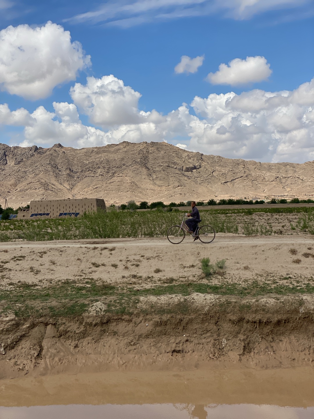 The image shows a man riding a bicycle on a dirt road in Mandisar, Afghanistan. The road runs parallel to a brown, muddy canal, with a low bank separating the road from the canal. Behind the road is a…read more