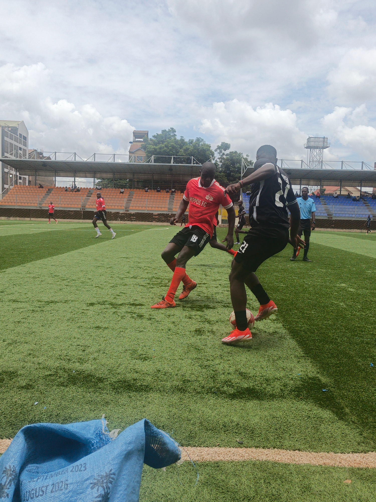 The photograph captures a soccer match in progress on a green artificial turf field. Two players are the central focus: one in a red jersey with "HIPPOS FC" on the front and the number 18 on the back,…read more
