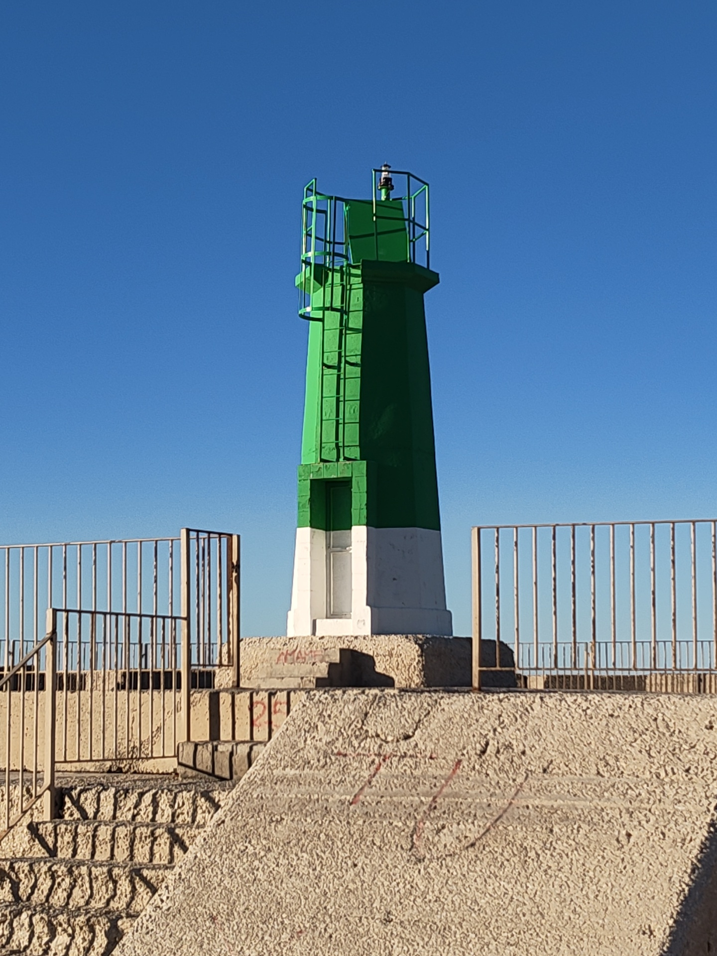 The image features a lighthouse in Dénia, Spain. The lighthouse is painted green on top and white on the bottom. It has a metal ladder attached to the side and a small railing around the top platform.…read more