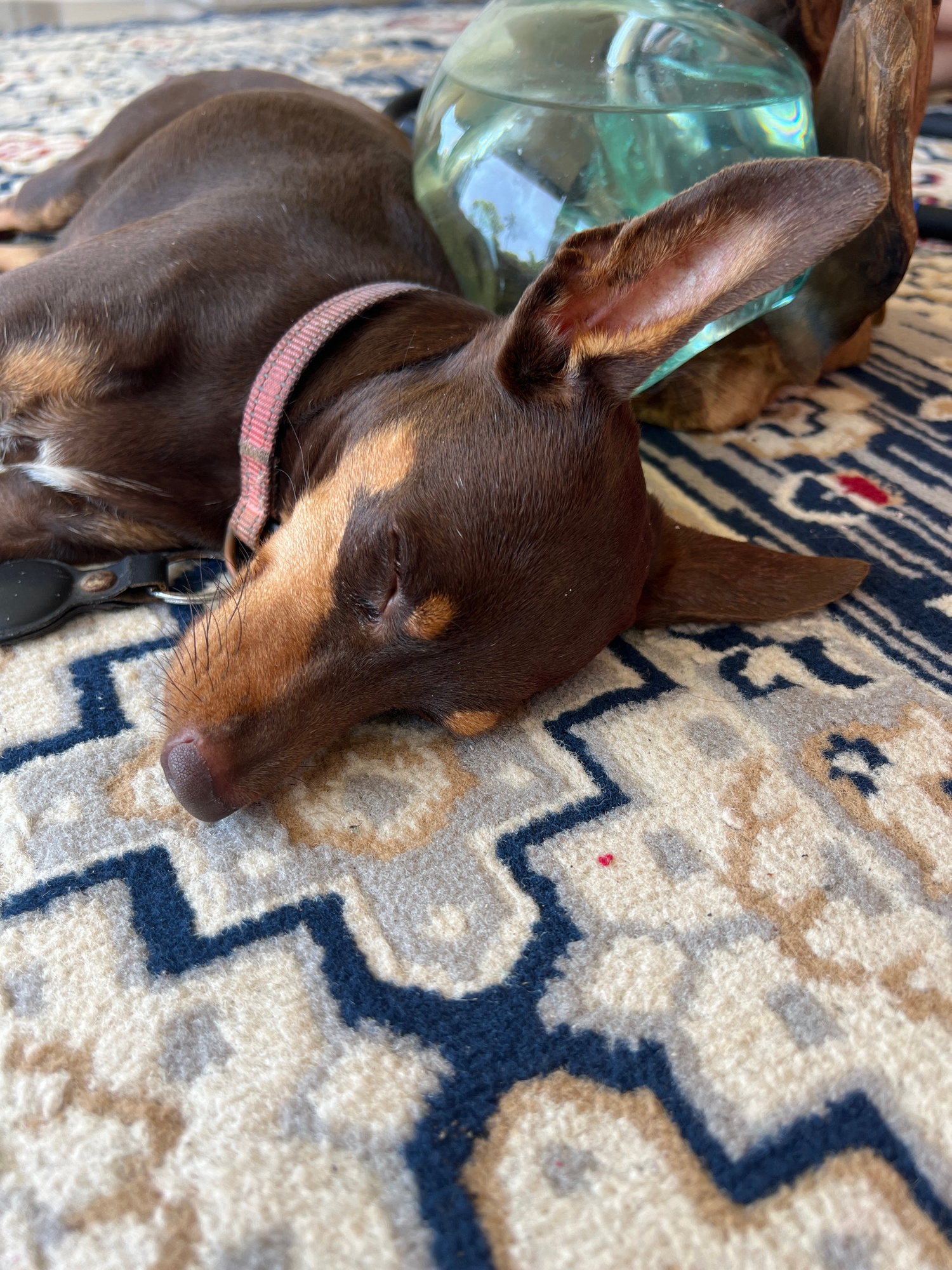 A brown and tan miniature pinscher with a red collar sleeps on a patterned rug with zig-zag shapes and colors of beige, gray, and navy blue. A clear glass vase is partially visible at the upper left.…read more