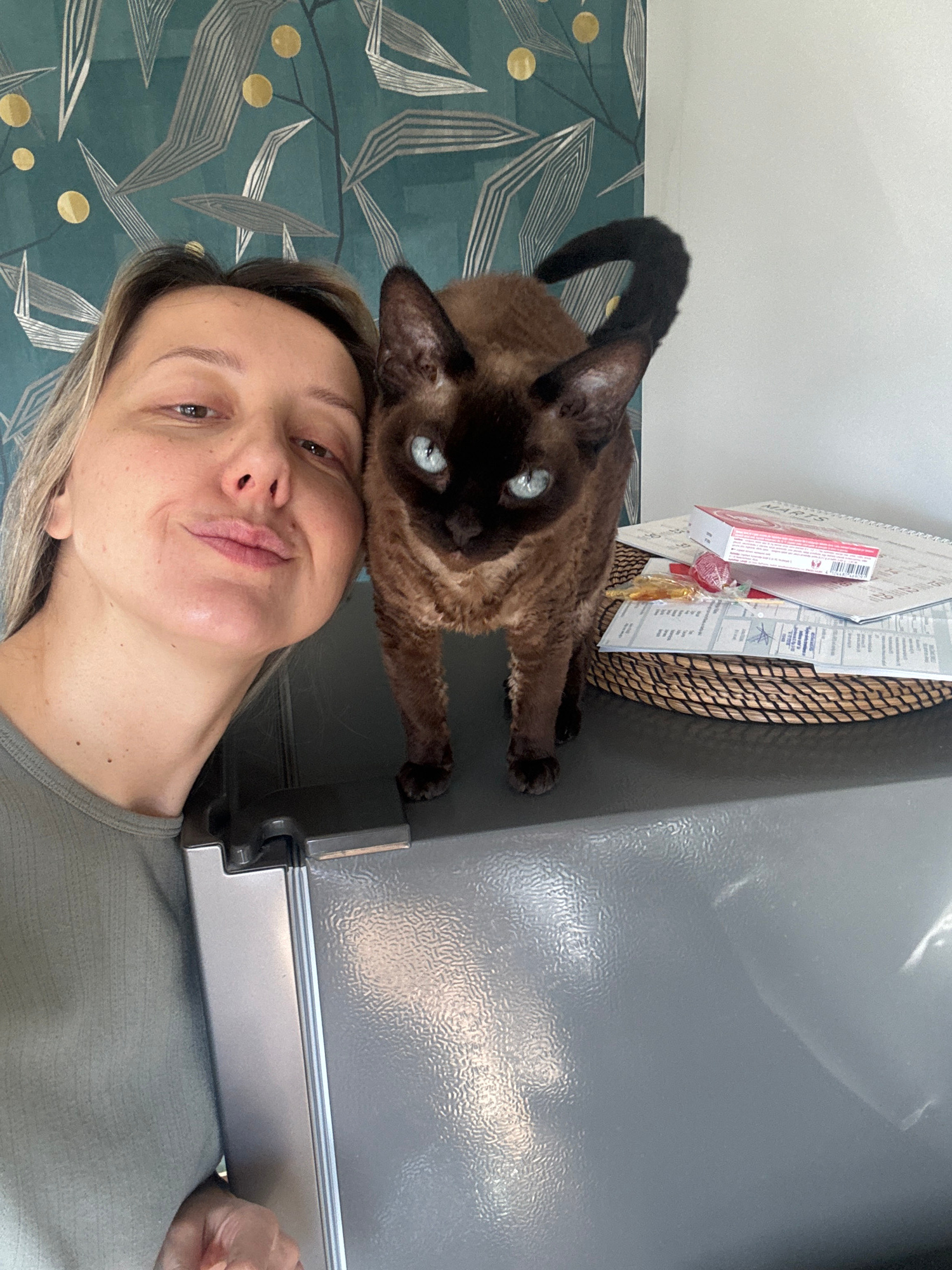 A woman with fair skin, blonde hair, and light-colored eyes is positioned at the bottom of the frame. A dark brown cat with blue eyes lies above her, on what appears to be the top of a refrigerator. A…read more