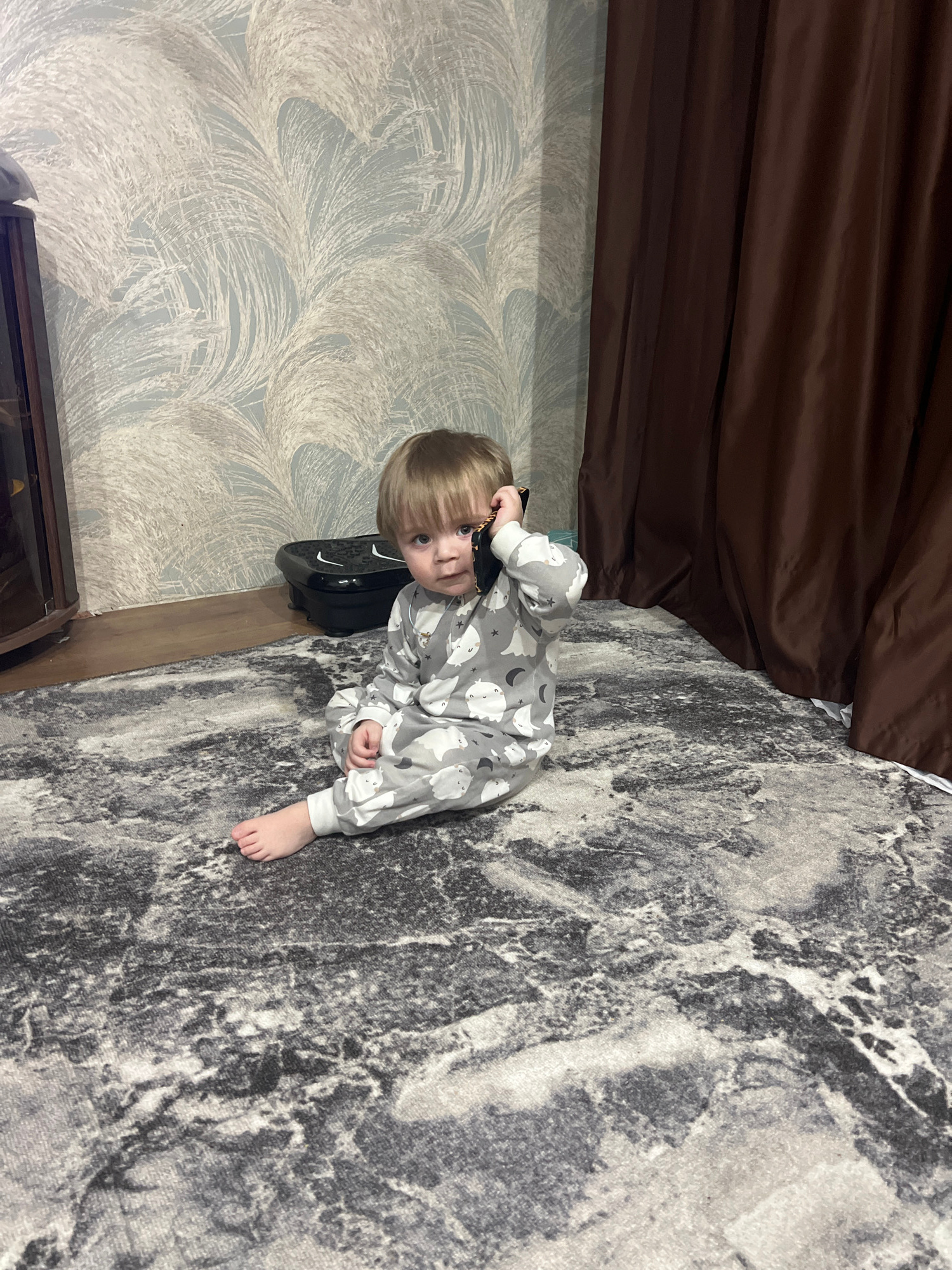 This indoor scene, located in Noviy, Russia, features a young child seated on a multi-toned grey and white patterned rug. The child has light-colored hair and is dressed in grey pajamas with a repeati…read more