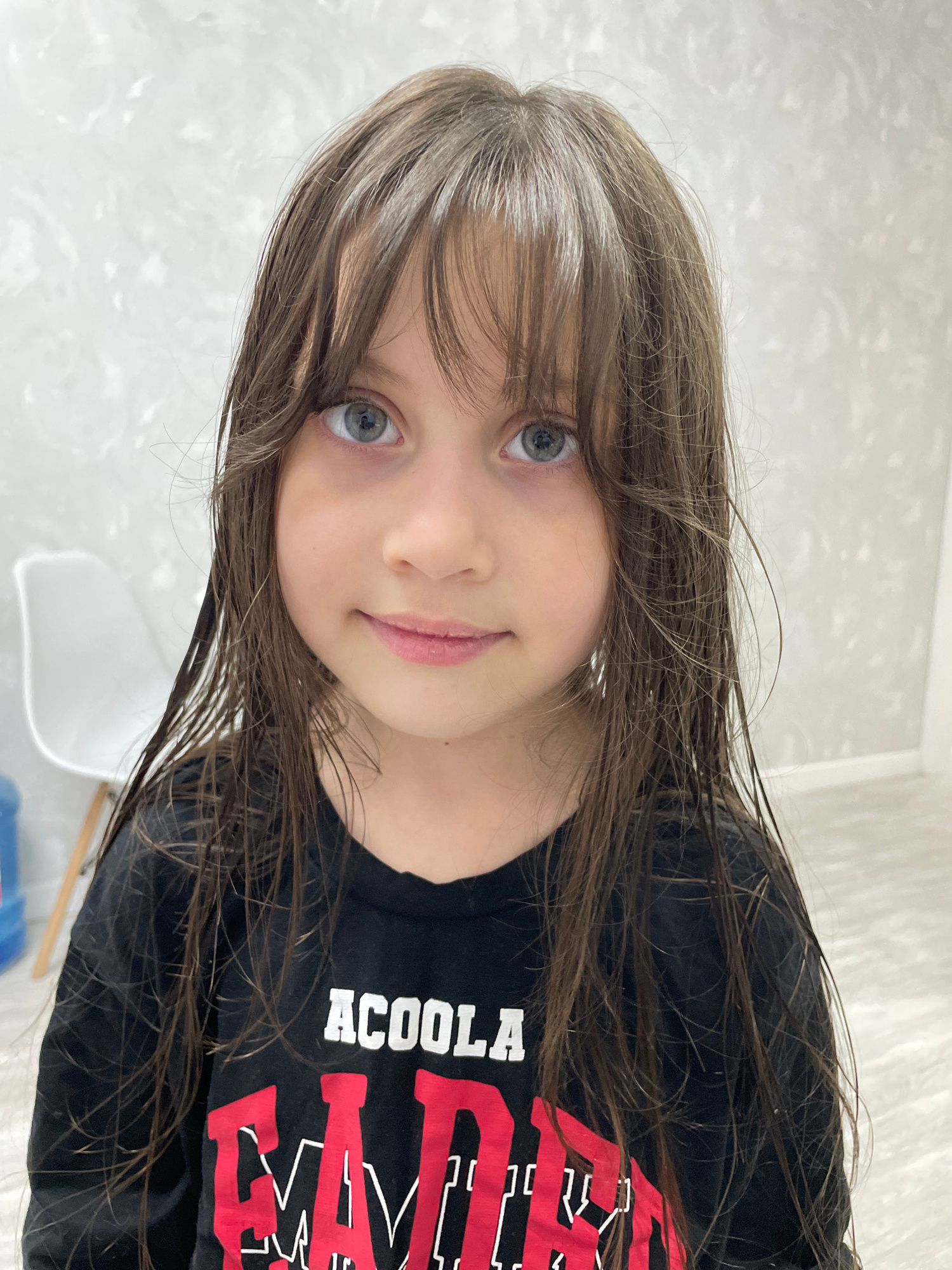 A young person with damp brown hair and gray roots, blue eyes, and fair skin is looking up at the camera. They are wearing a black T-shirt with white and red lettering. The background consists of a wh…read more