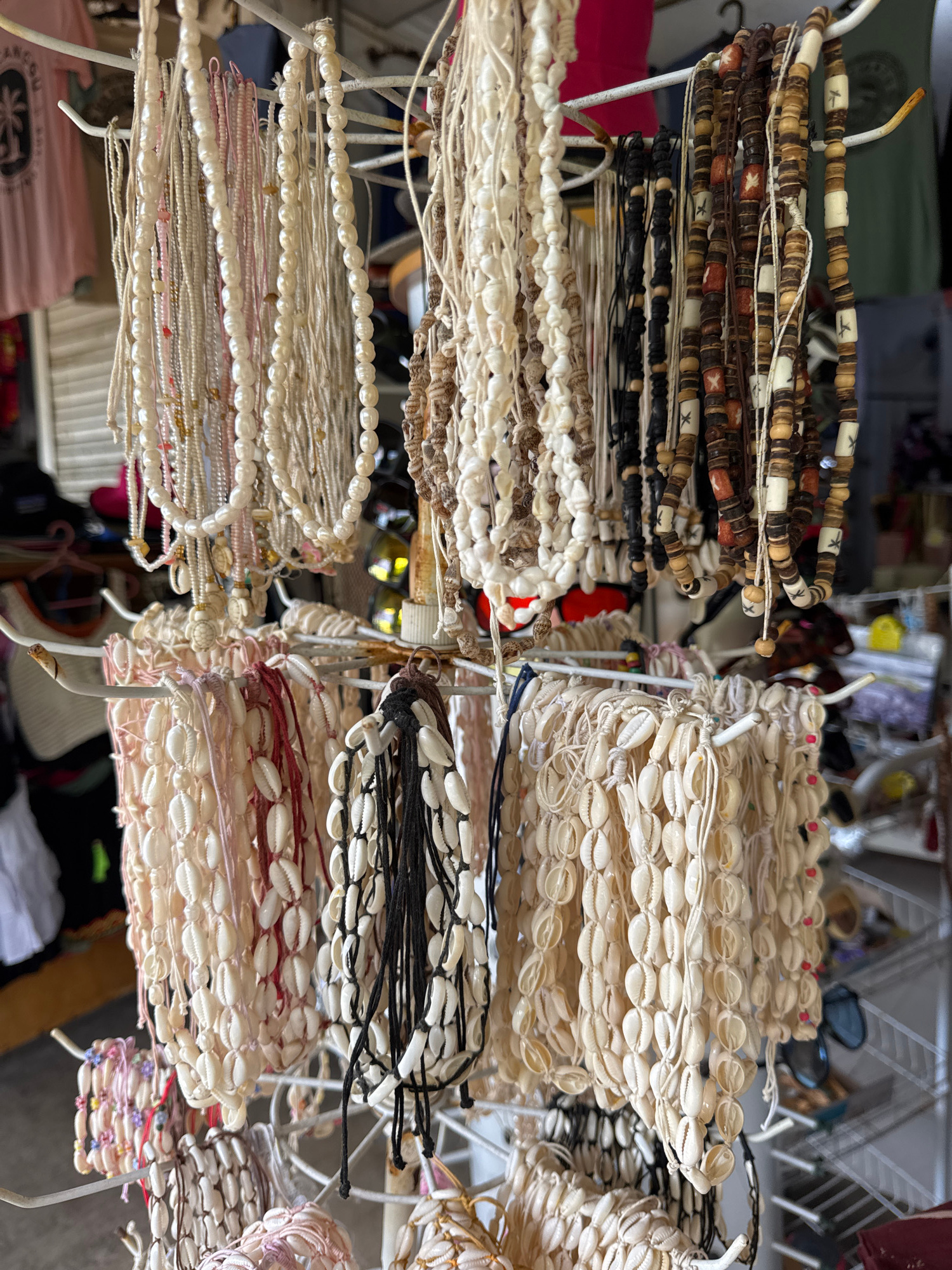 This image shows a close-up view of a display of bracelets at a store in Kuta Selatan, Indonesia. The bracelets are arranged on a white metal rack. The bracelets are made from a variety of materials,…read more