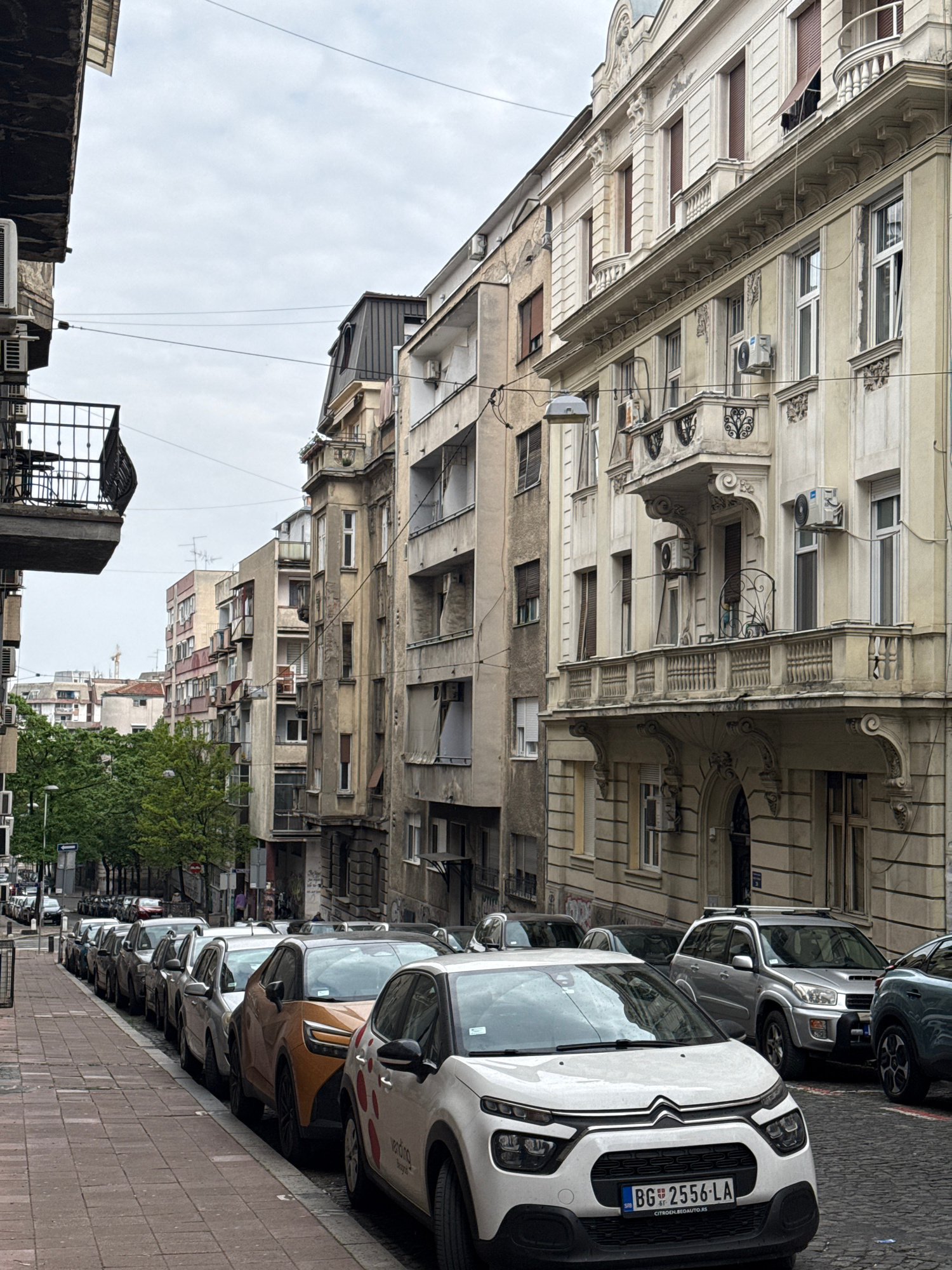 The image depicts a street scene in Belgrade, Serbia. The scene showcases a row of parked cars along a brick sidewalk. The vehicles range in color from white to gray and brown. The foreground features…read more
