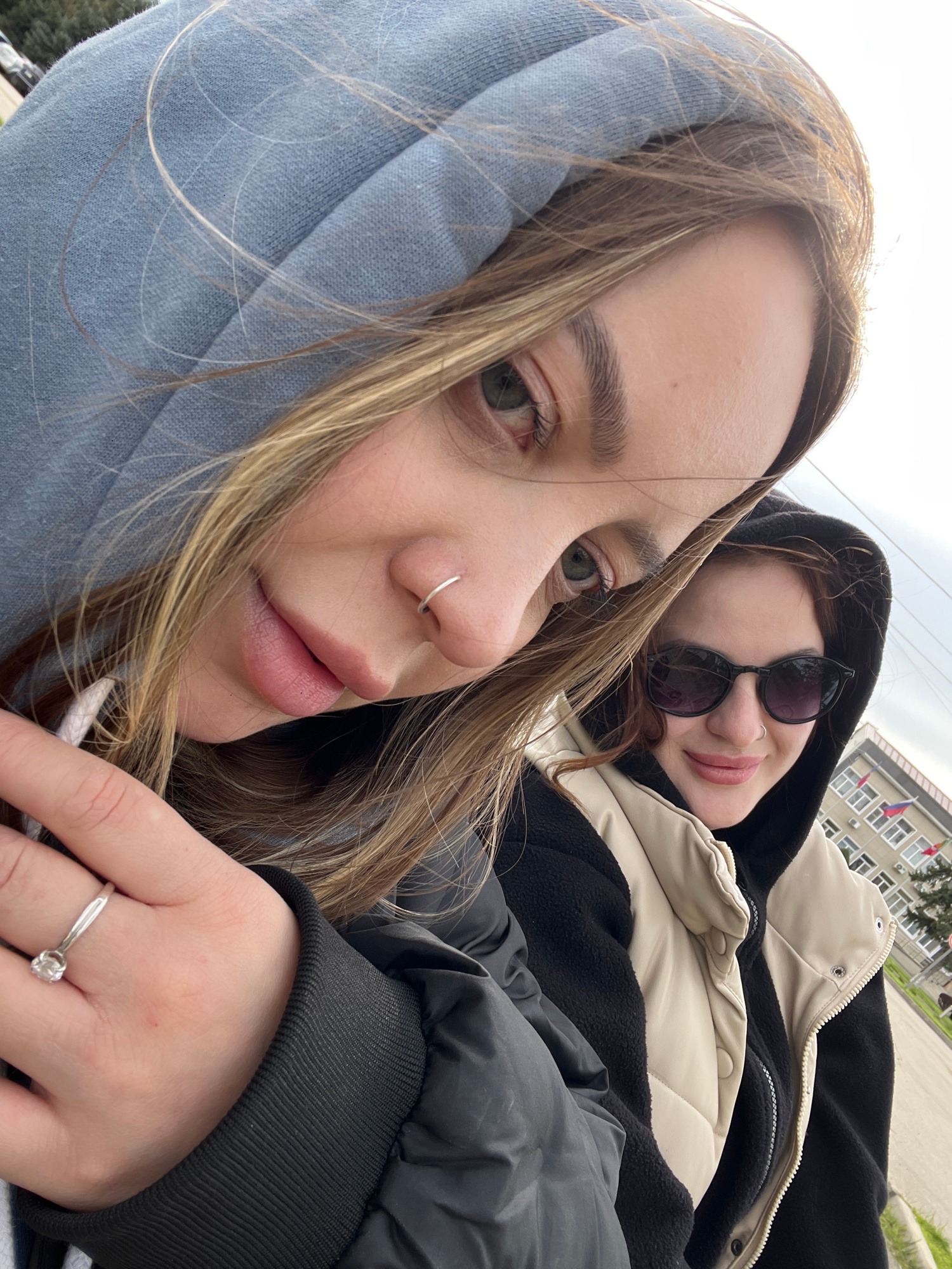 Two young women are posing for a selfie. The woman in the foreground has light brown hair and is wearing a gray hoodie. She has a nose ring and a ring on her left ring finger. The other woman is weari…read more