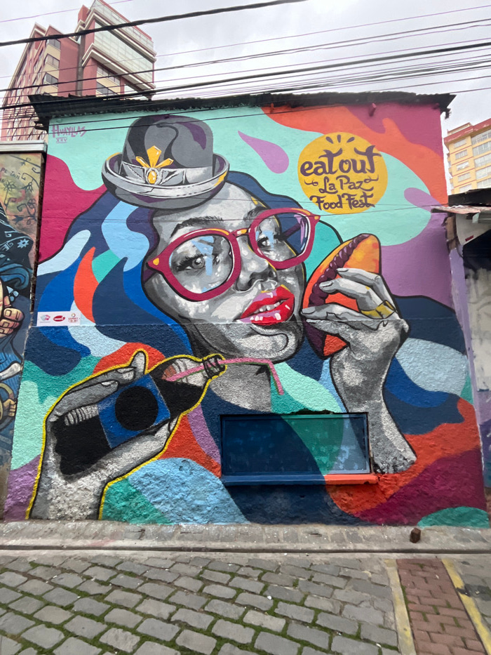 A vibrant mural features a person wearing large red sunglasses and a hat, seemingly enjoying food and drink. A hand holds a sandwich or empanada above their head, while another hand presents a bottled…read more