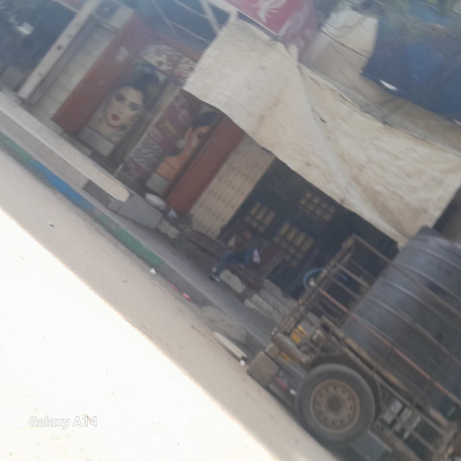 The image depicts an outdoor street scene, captured from a tilted, diagonal perspective. The setting appears to be a commercial or residential area with buildings lining one side of a road or pathway.…read more