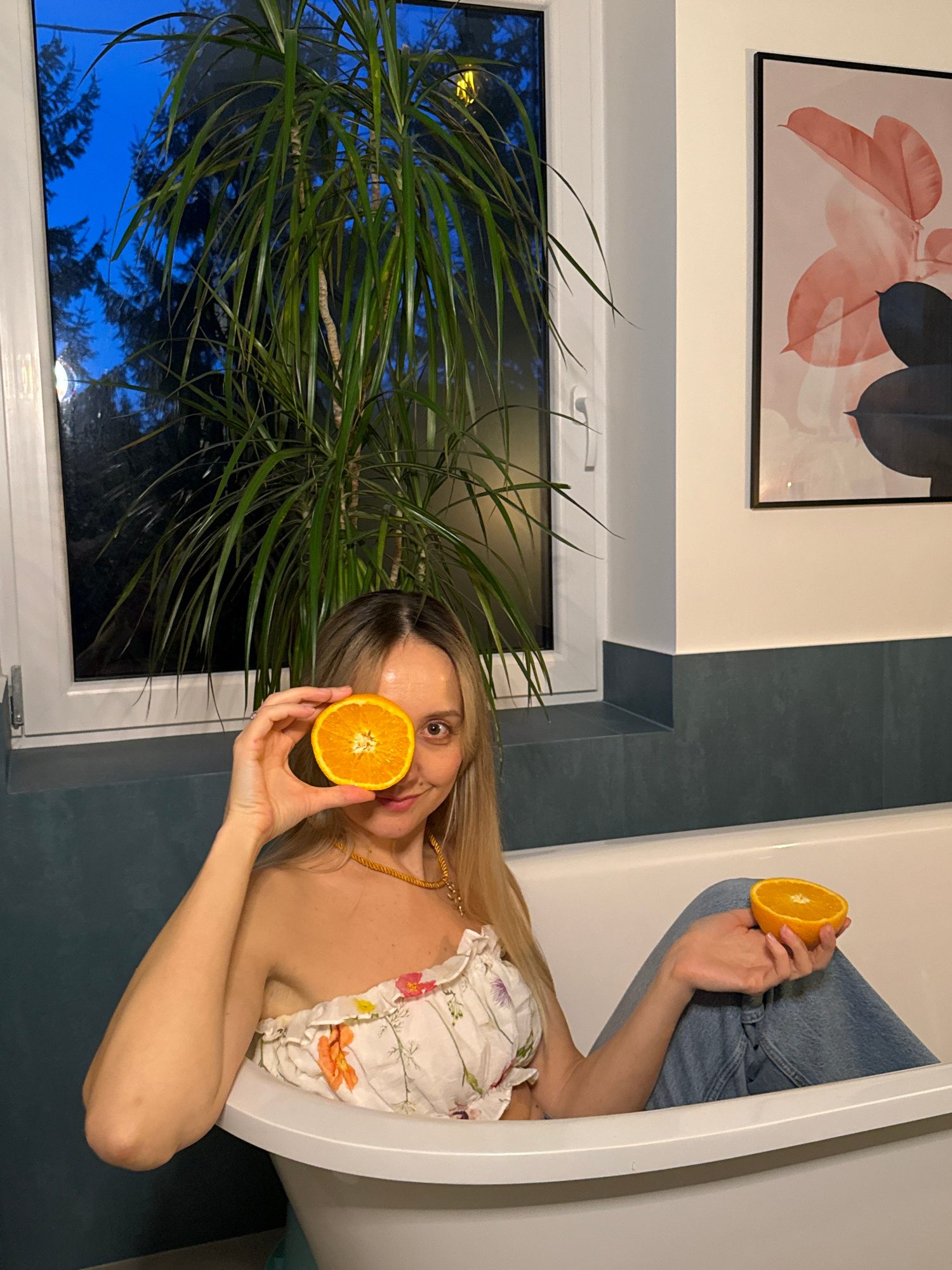 A woman with long blonde hair, wearing a floral top and jeans, is seated in a white bathtub, holding halves of an orange up to her eyes. A houseplant is visible near a window, and artwork hangs on theβ¦read more