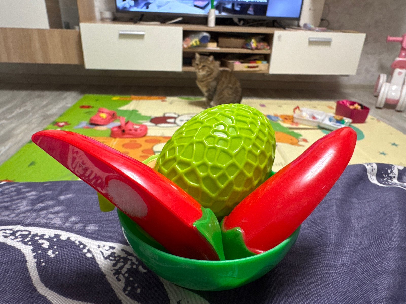 The image shows a child's play set on a patterned surface, consisting of a green plastic bowl containing a green, textured spherical toy and two red, elongated toy peppers. In the background, a light-…read more