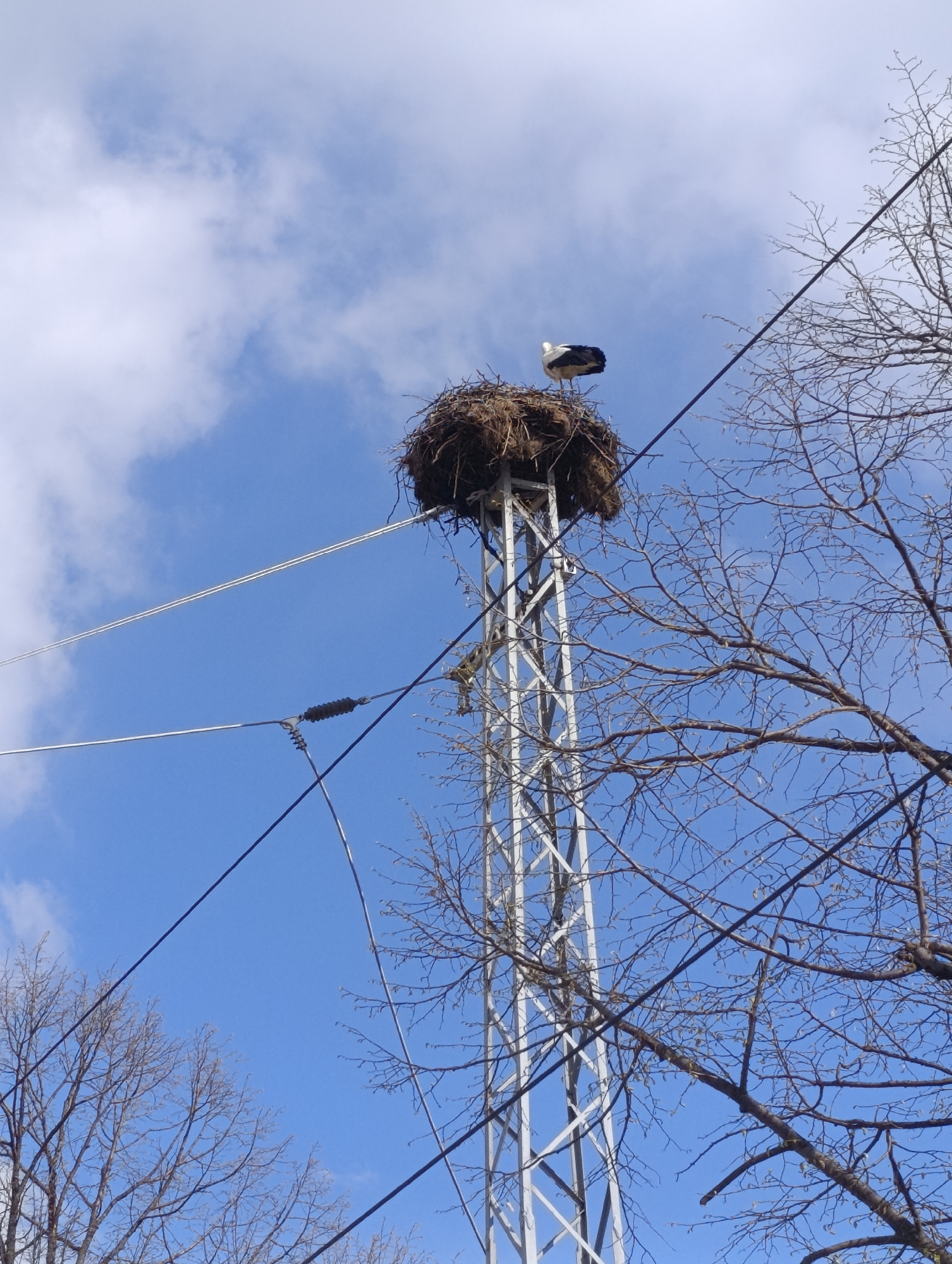 A white stork stands in a large, disheveled nest made of sticks and straw atop a white, metal lattice tower. The tower is located outdoors in Belozem, Bulgaria and is surrounded by bare-branched trees…read more