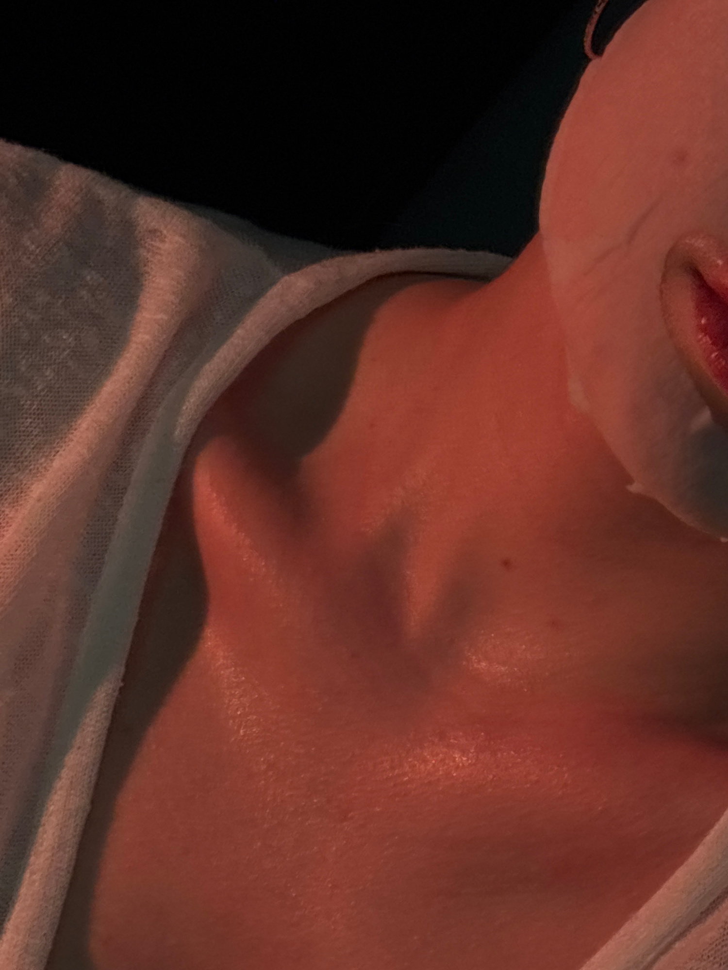 The image shows a close-up view of a person's neck and part of their face, specifically the mouth area. The skin appears reddish due to the lighting. A white substance, likely a skincare product, is v…read more