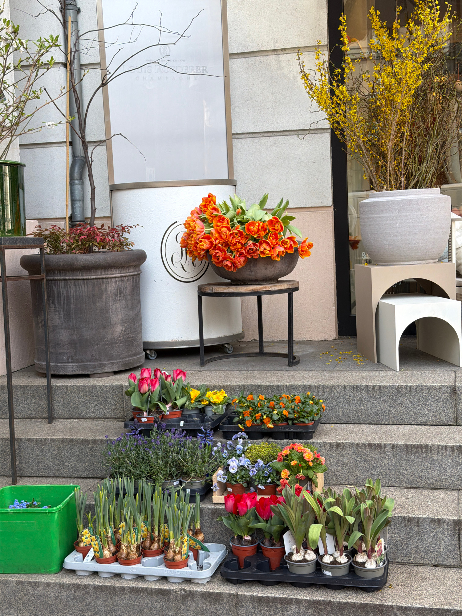 The image shows an outdoor flower arrangement on the steps of a building. There are various potted plants and flowers, including tulips (orange and red), daffodils, and other mixed flowers. A large po…read more
