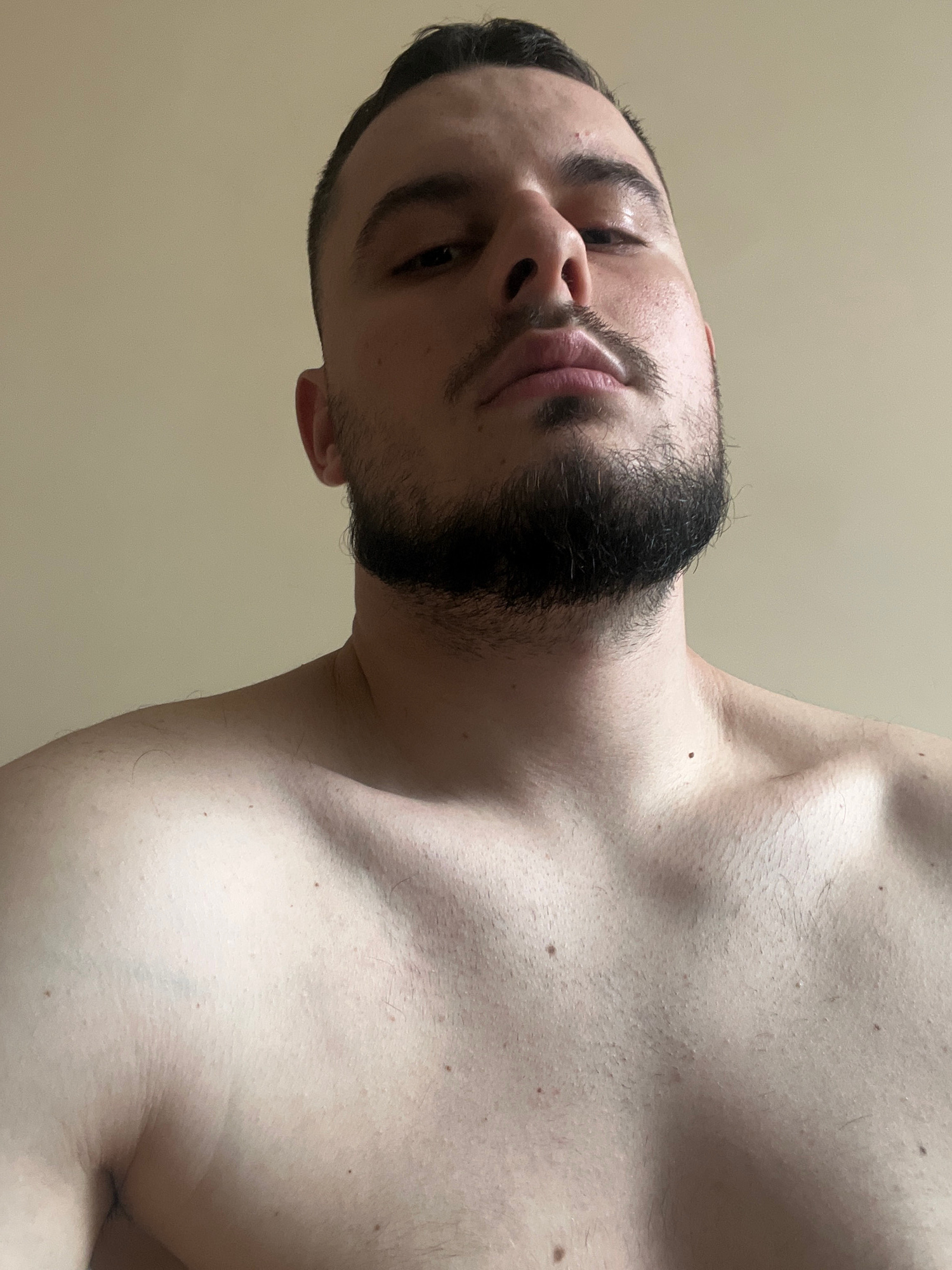 A close-up shot of a man's face and upper torso from a low-angle perspective. The man has dark hair, a beard, and fair skin. He is shirtless, revealing his chest and shoulders. The background is a pla…read more