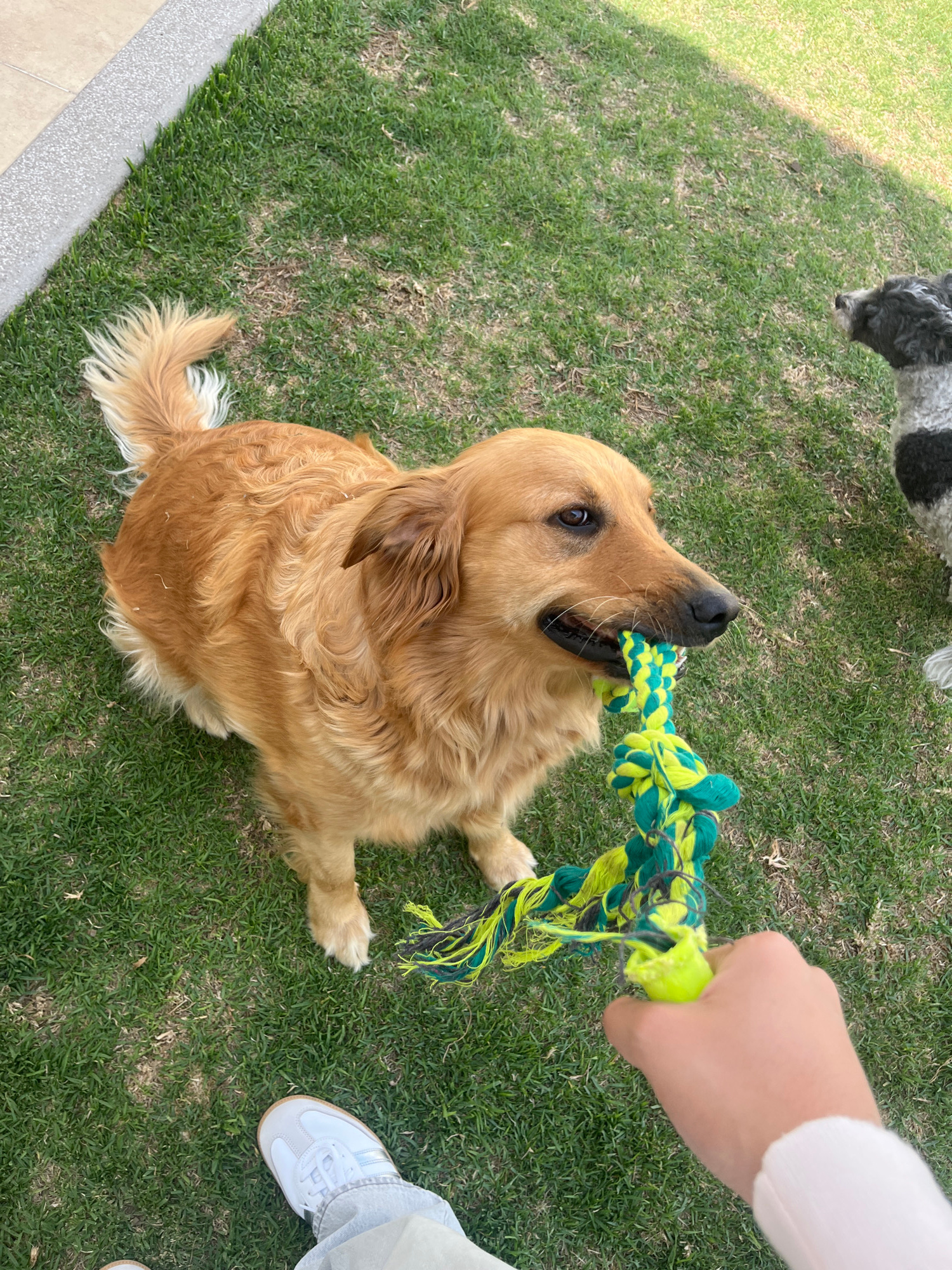 The scene depicts a golden retriever dog in Barrio de Nuevo León, Mexico, playing tug-of-war with a person on a grassy lawn. The dog has a green and yellow rope toy in its mouth. A second dog with bla…read more