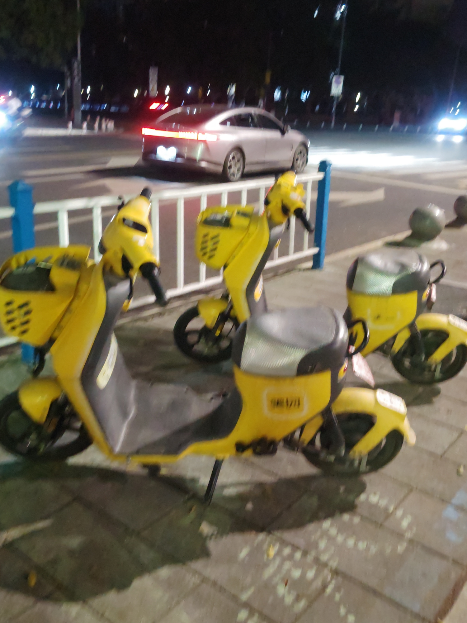 The image shows a row of parked yellow electric scooters along a sidewalk in Chongqing High-tech Zone, China. A white car is parked next to the scooters. A white and blue ladder-like structure is betw…read more