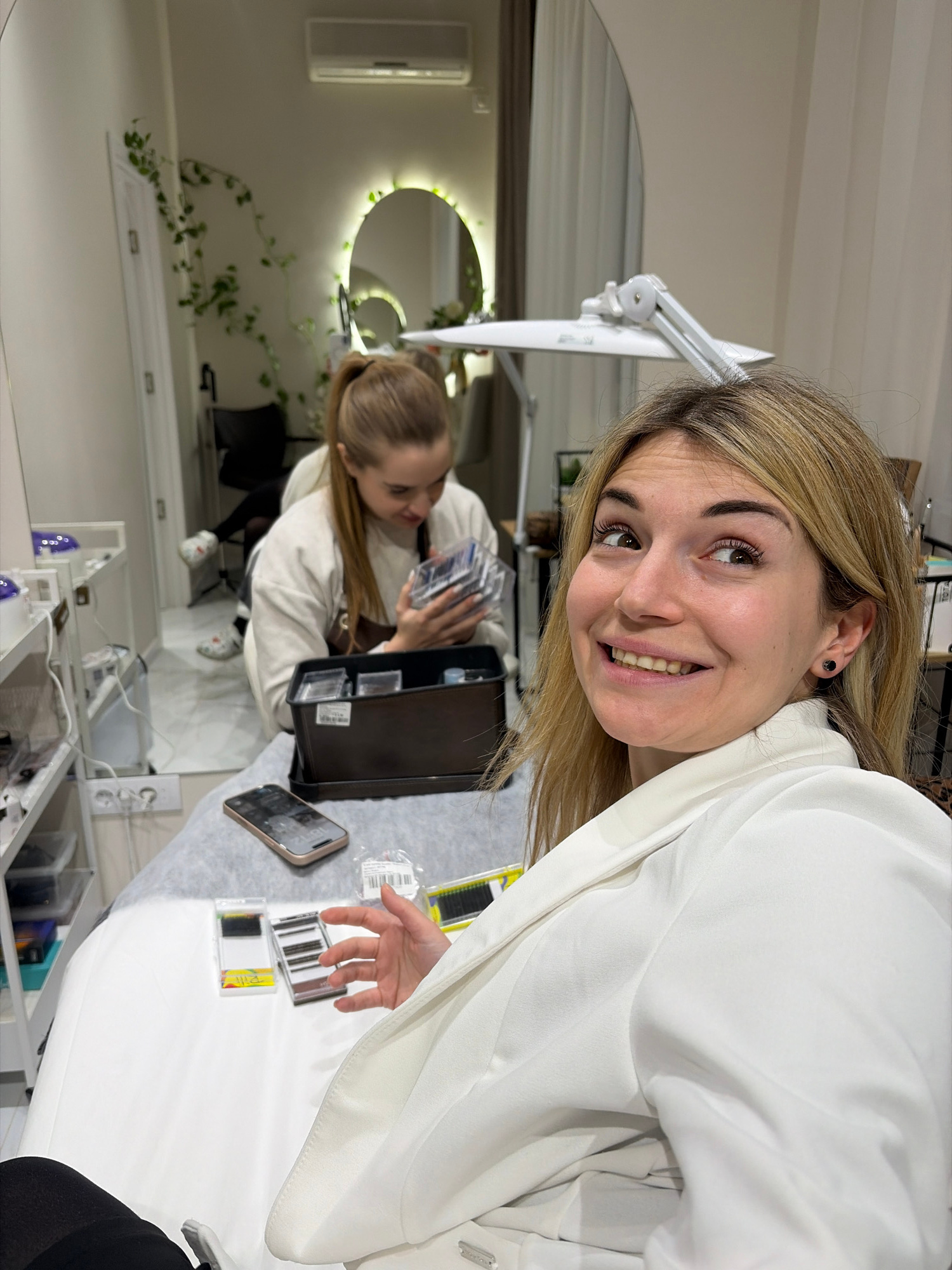 A vertically-oriented, eye-level indoor shot depicts two fair-skinned women and cosmetology supplies in a brightly lit room. The primary focus is on a blonde woman in the foreground wearing a white bl…read more