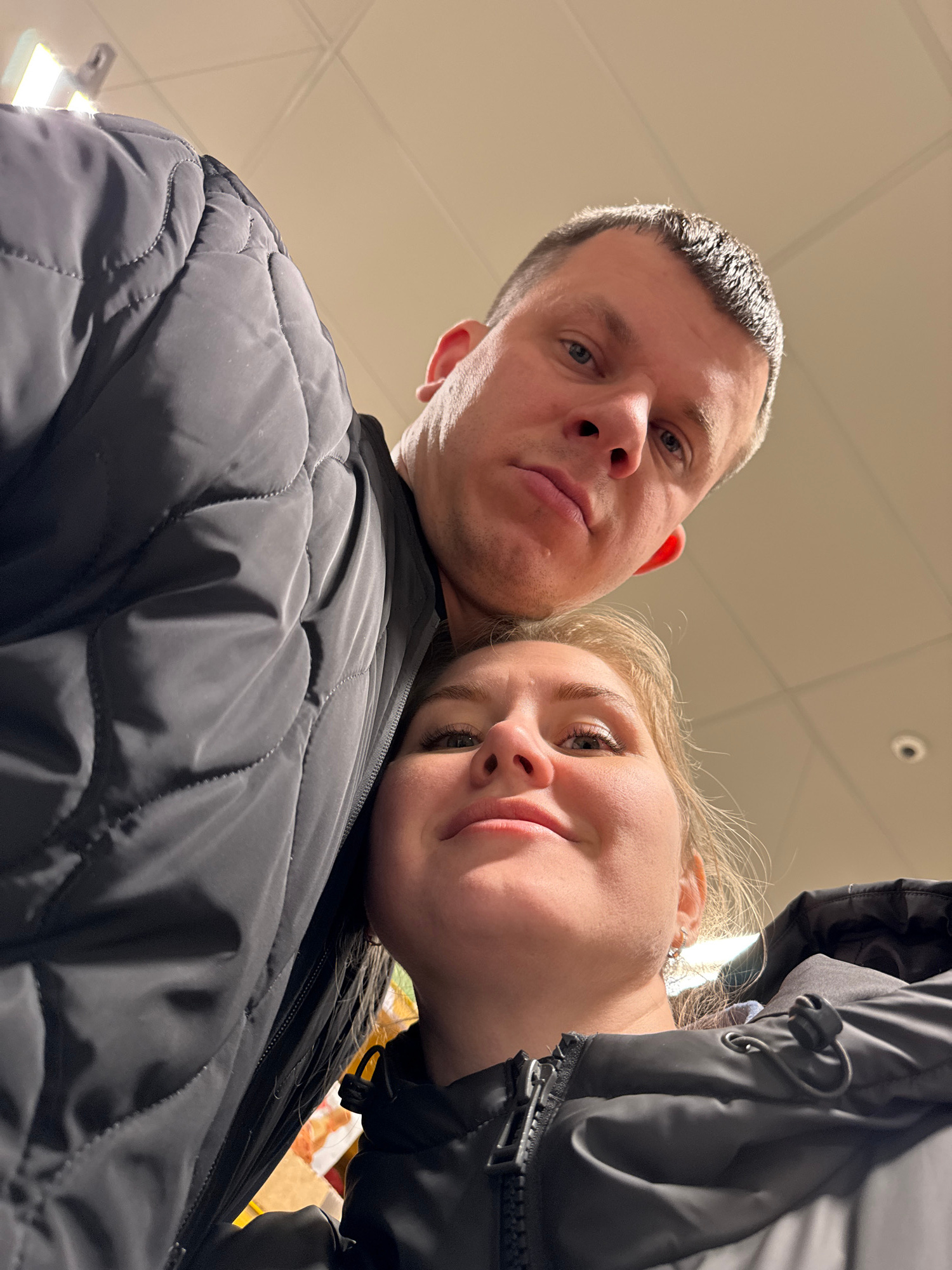A low-angle selfie captures a man and a woman together in what appears to be a retail environment. The man, with short, light-colored hair, is to the left, his expression neutral. To his right, the wo…read more