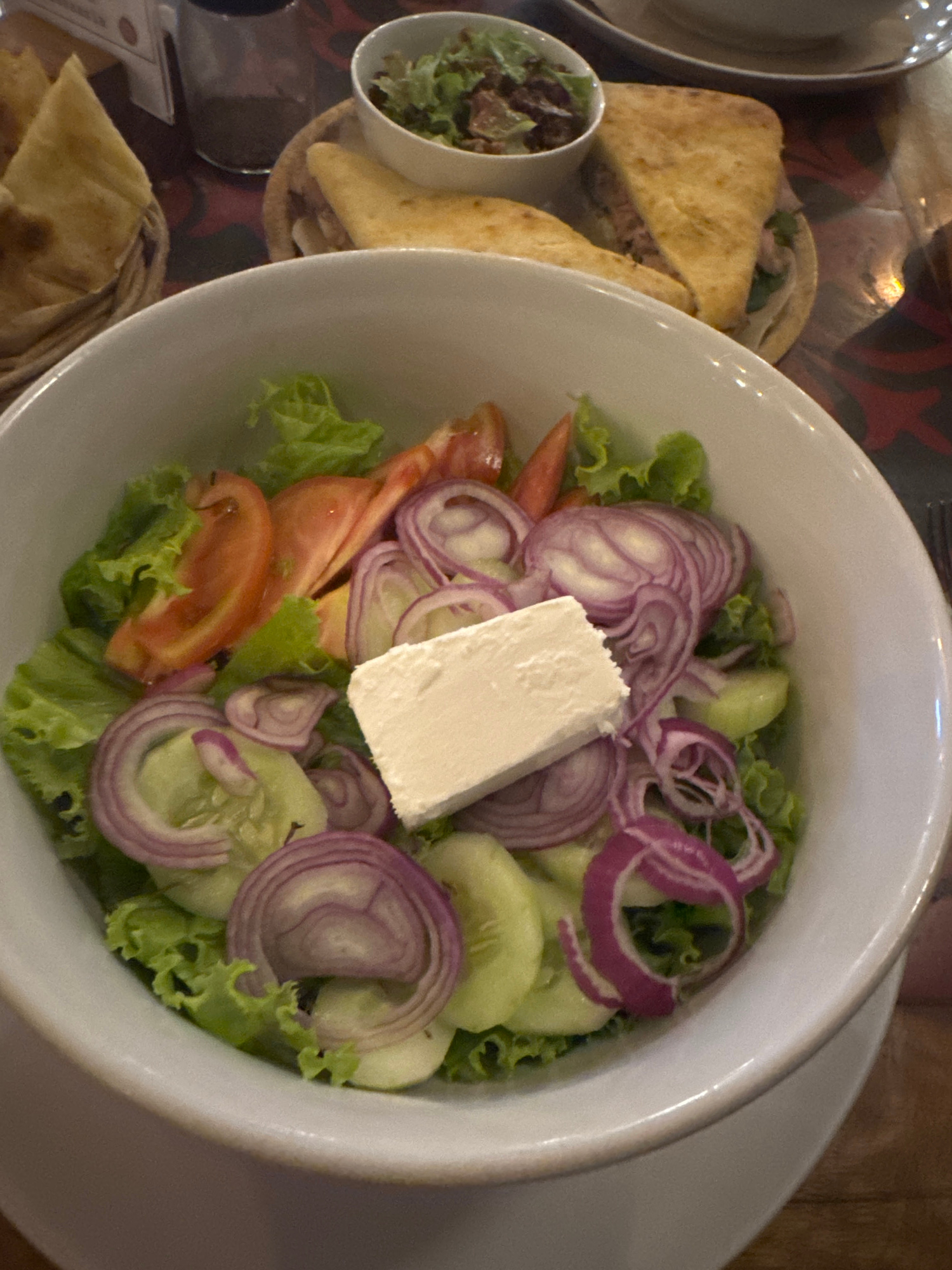 The image presents a dining table scene, focusing on a white bowl filled with a salad composed of lettuce, sliced cucumbers, tomato wedges, and prominent red onion rings. At the center of the salad is…read more