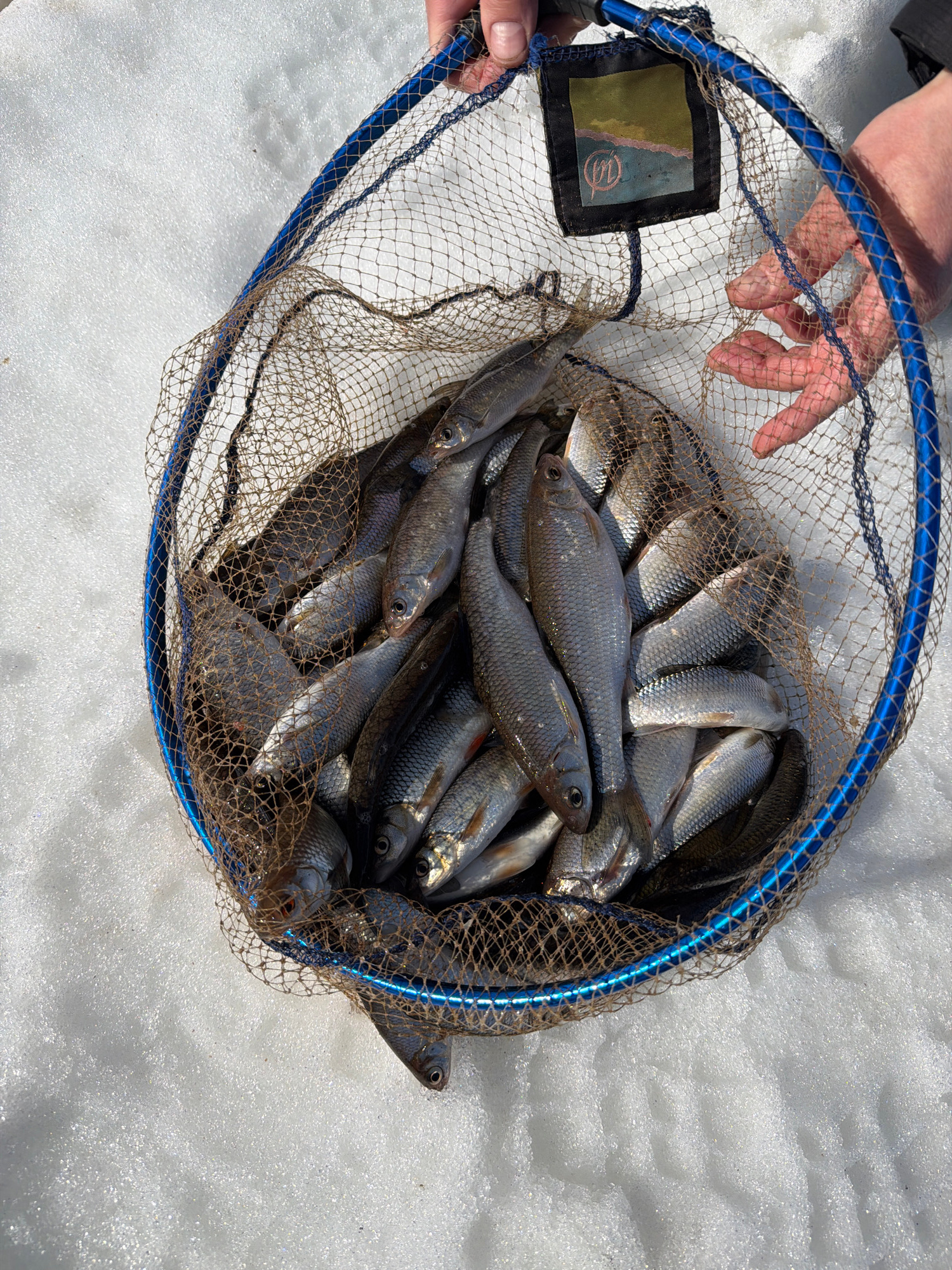 A fishing net filled with fish is displayed, held by a person, on a snowy surface. The net has a blue rim and a black patch with a logo visible. The fish are silver and appear to be of similar size an…read more