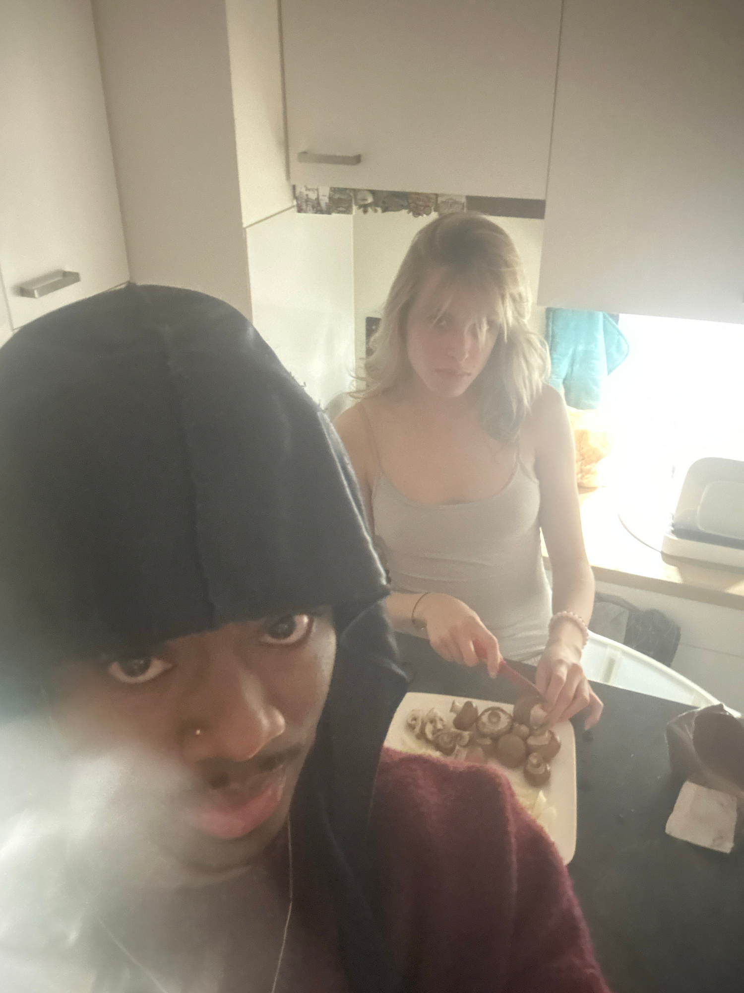 The image appears to be a selfie taken indoors. Two individuals are visible. One individual, in the foreground, has dark skin and wears a black head covering. They are looking directly at the camera.…read more