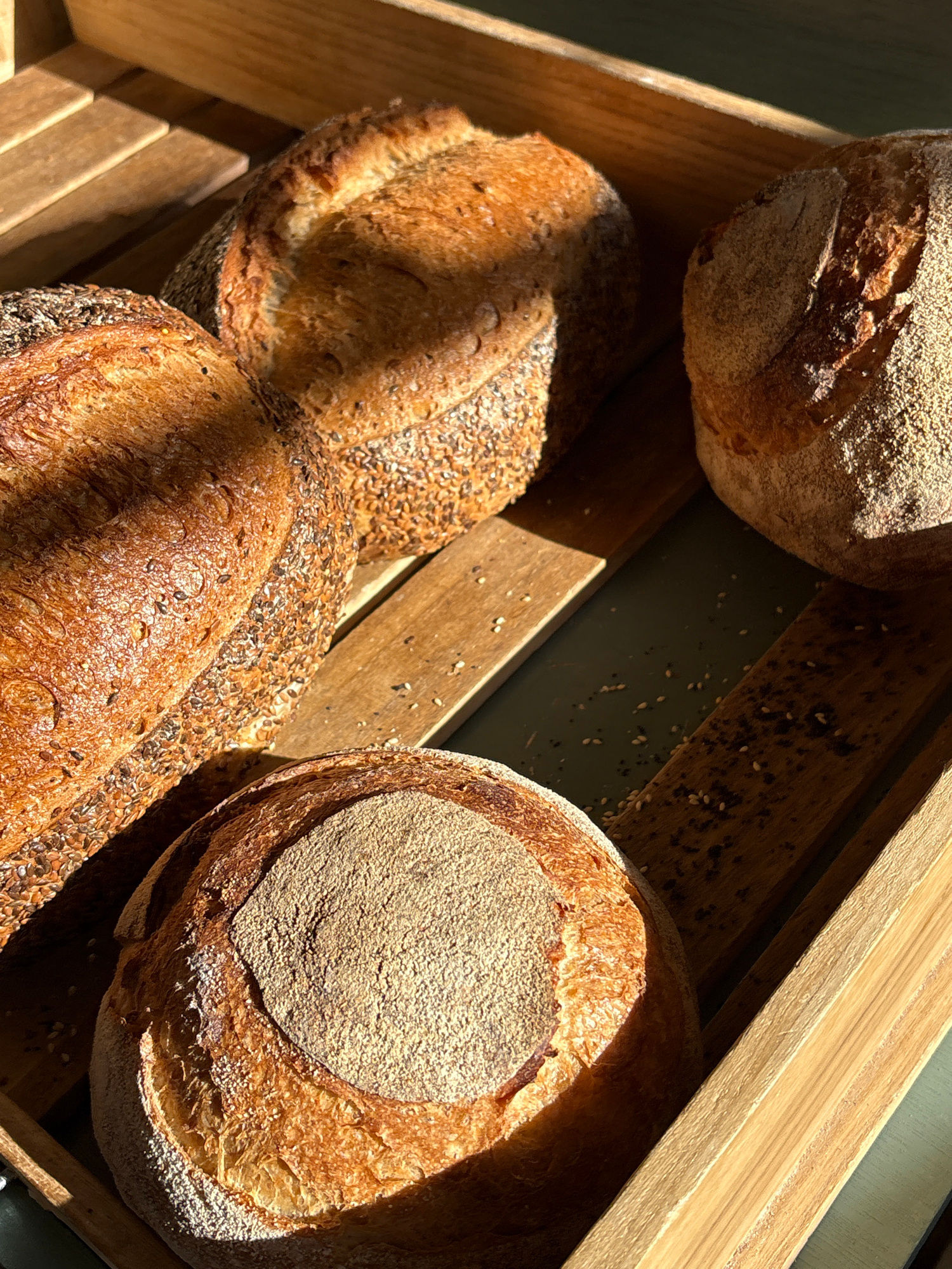 The image shows a wooden tray containing four loaves of bread. Two are round and have a circular dusting of flour on top, while the other two are oblong and covered in seeds. The tray has wooden slats…read more