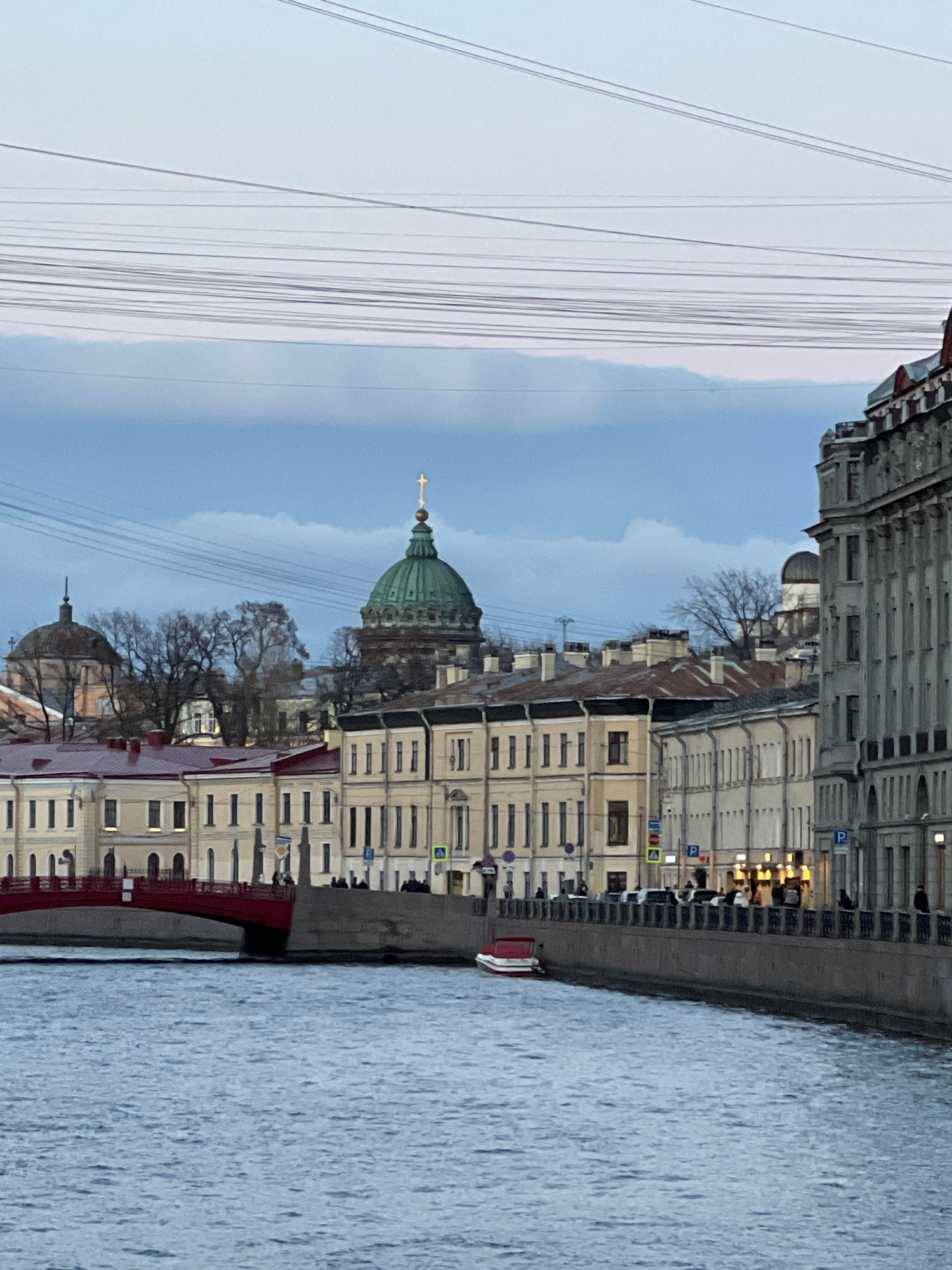 The image shows a waterfront scene in Saint Petersburg, Russia. The iconic green dome of St. Isaac's Cathedral is visible, situated amongst other buildings with pale facades. A body of water, likely t…read more