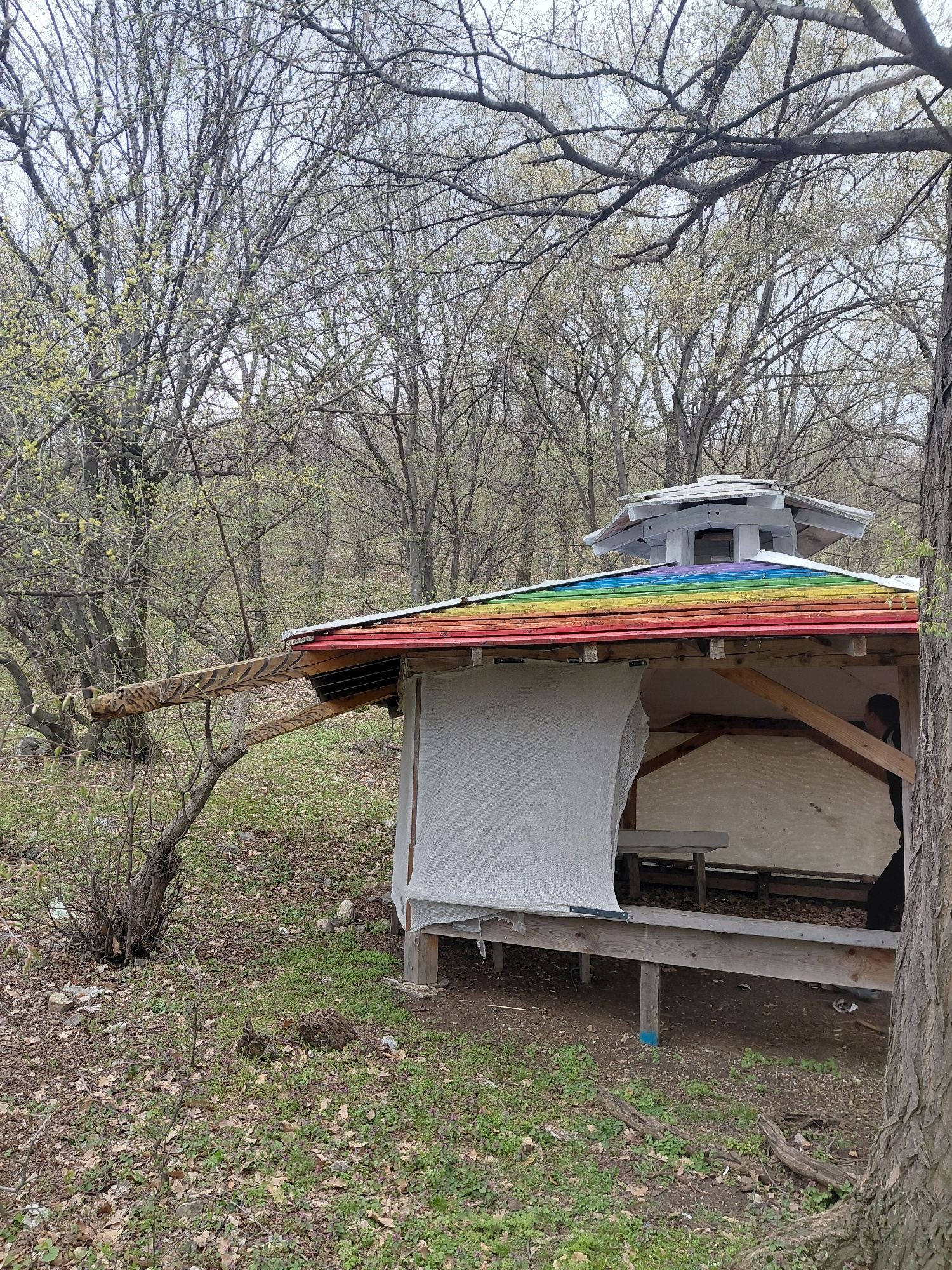 The image shows an outdoor structure with a rainbow-colored roof located in a wooded area. The structure appears to be a small wooden shed or shelter with a white interior wall visible. A tree trunk i…read more