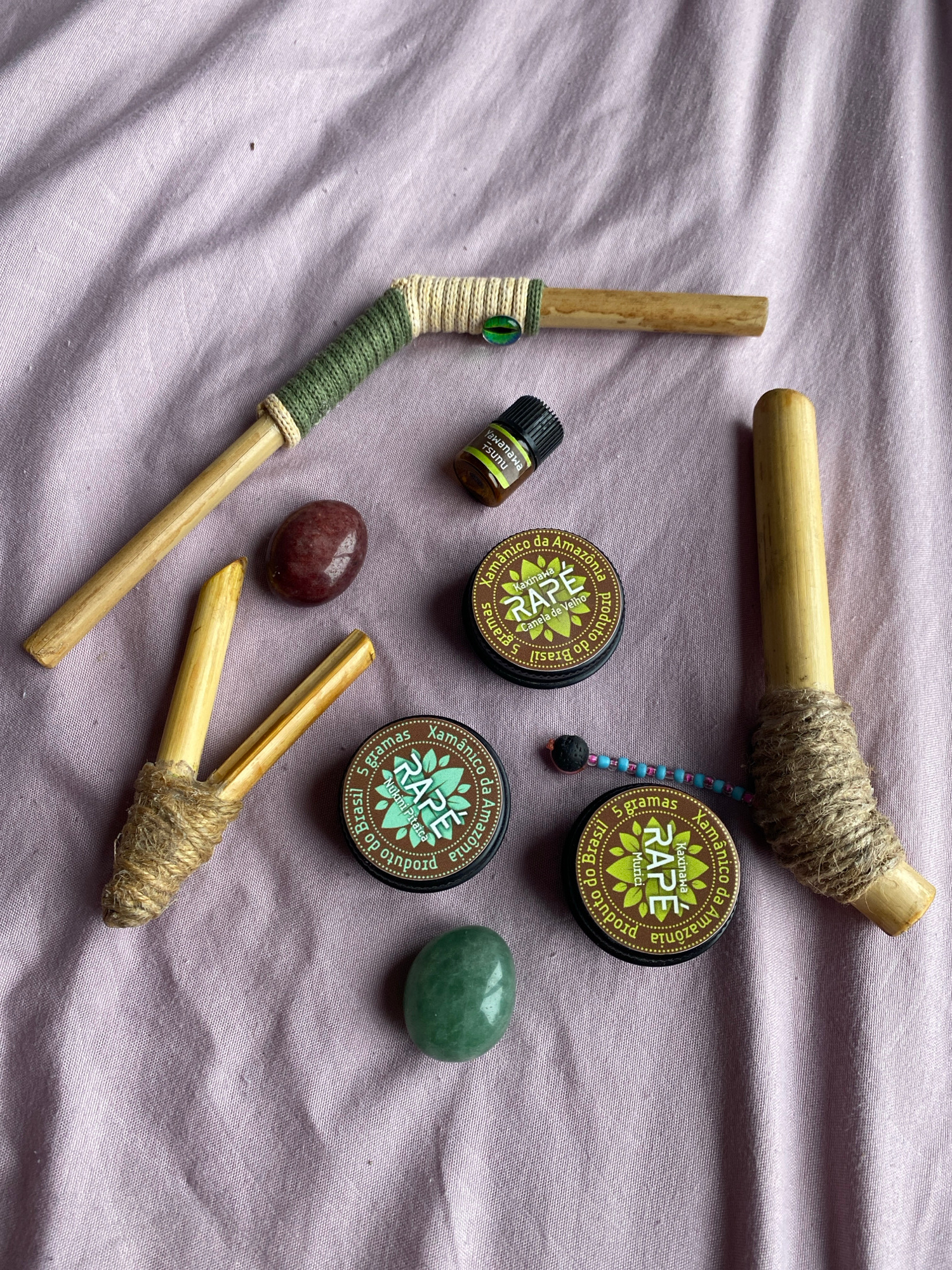The image shows an arrangement of items, seemingly related to traditional medicine or spiritual practices. The backdrop is a light purple fabric, likely a cloth or sheet. Arranged on the fabric are se…read more