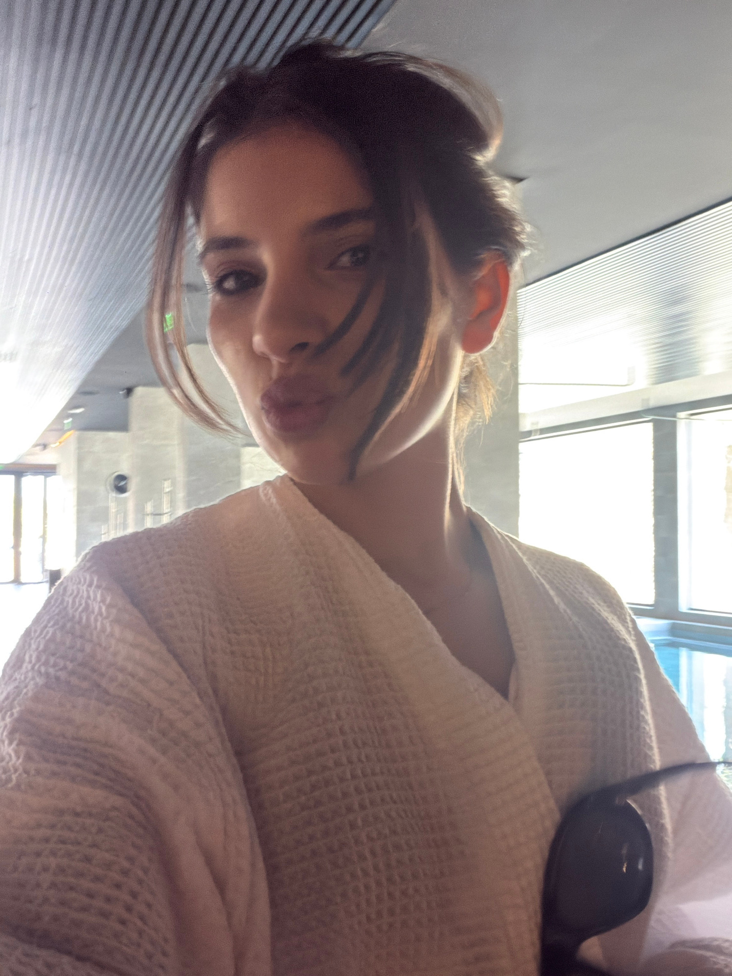 A woman is wearing a white waffle-weave bathrobe, possibly in a spa or hotel setting. The location appears to be indoors, with a window providing bright daylight. The environment may be within the ci…read more