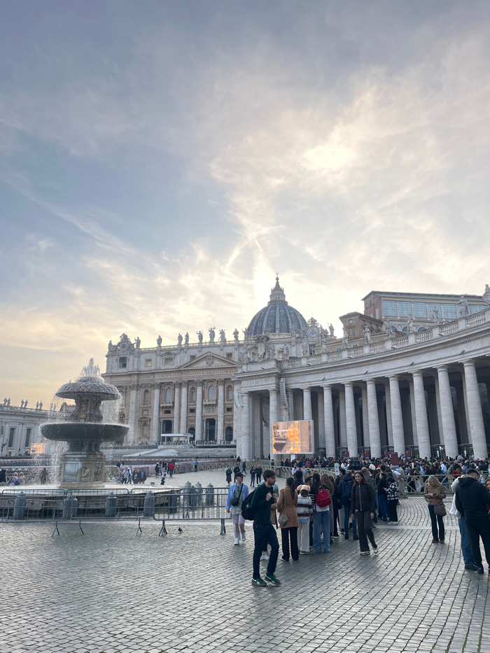 The image depicts an expansive view of St. Peter's Square in Vatican City, Roma, Italy, under a light blue sky with scattered white clouds. St. Peter's Basilica dominates the background, featuring its…read more