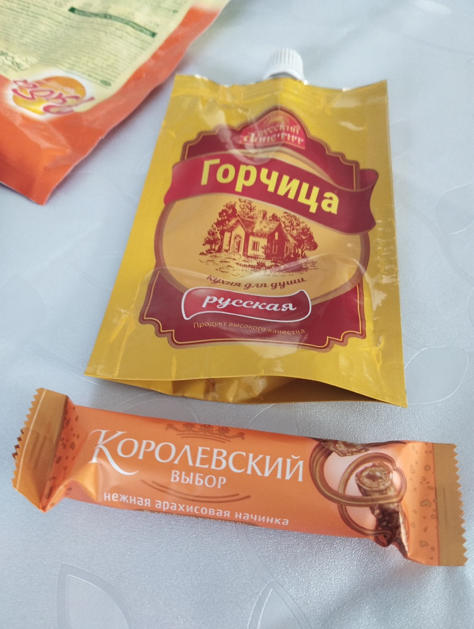 The image depicts a tabletop scene. There is a packet of mustard with Russian labeling and a picture of a house on it, a package of orange dessert bar with Russian labeling that indicates that the iteβ¦read more